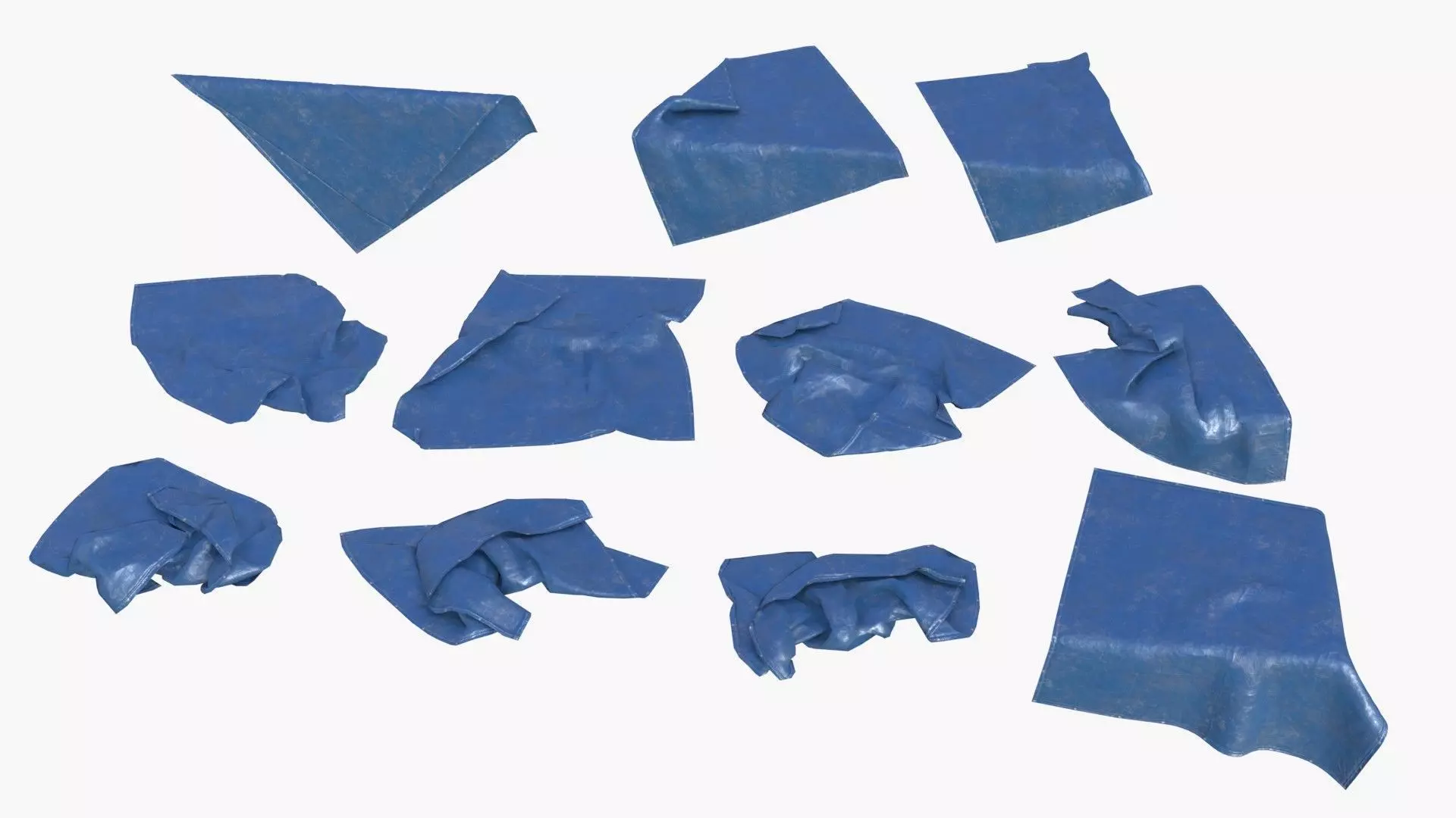 This asset includes 11 tarp dropped configurations. All tarps share the same material and are 2 m square dimensions. The material includes 4 variants of Base Color with Blue, Green, Black or Yellow colors.