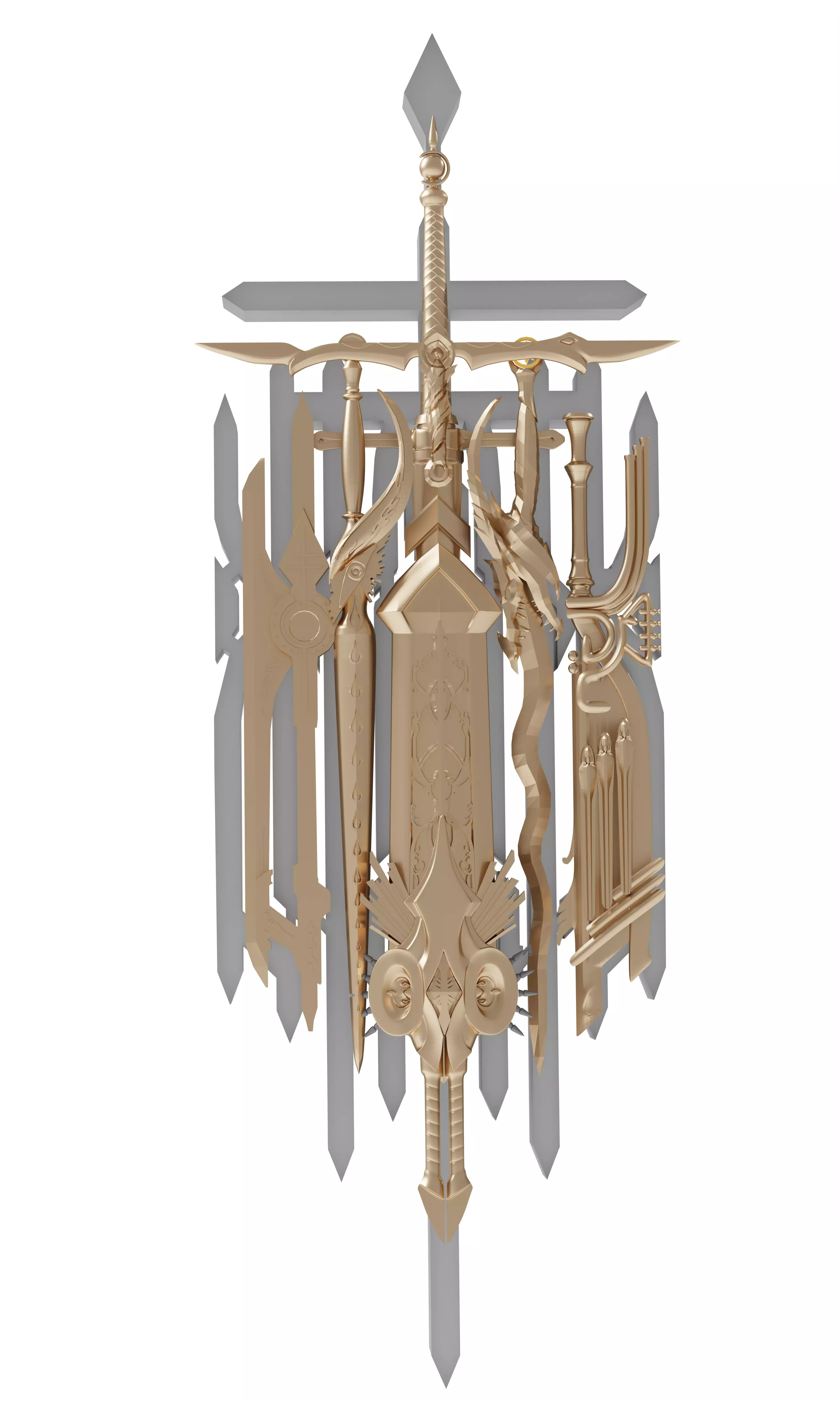 Highlights of the Model:• Seven fantasy sword designs in one piece.• Collector-level gold detailing and magical symbols.• Symmetrical arrangement for a powerful and three-dimensional look.• Perfect for collectors, fantasy model enthusiasts, and weapon design lovers.