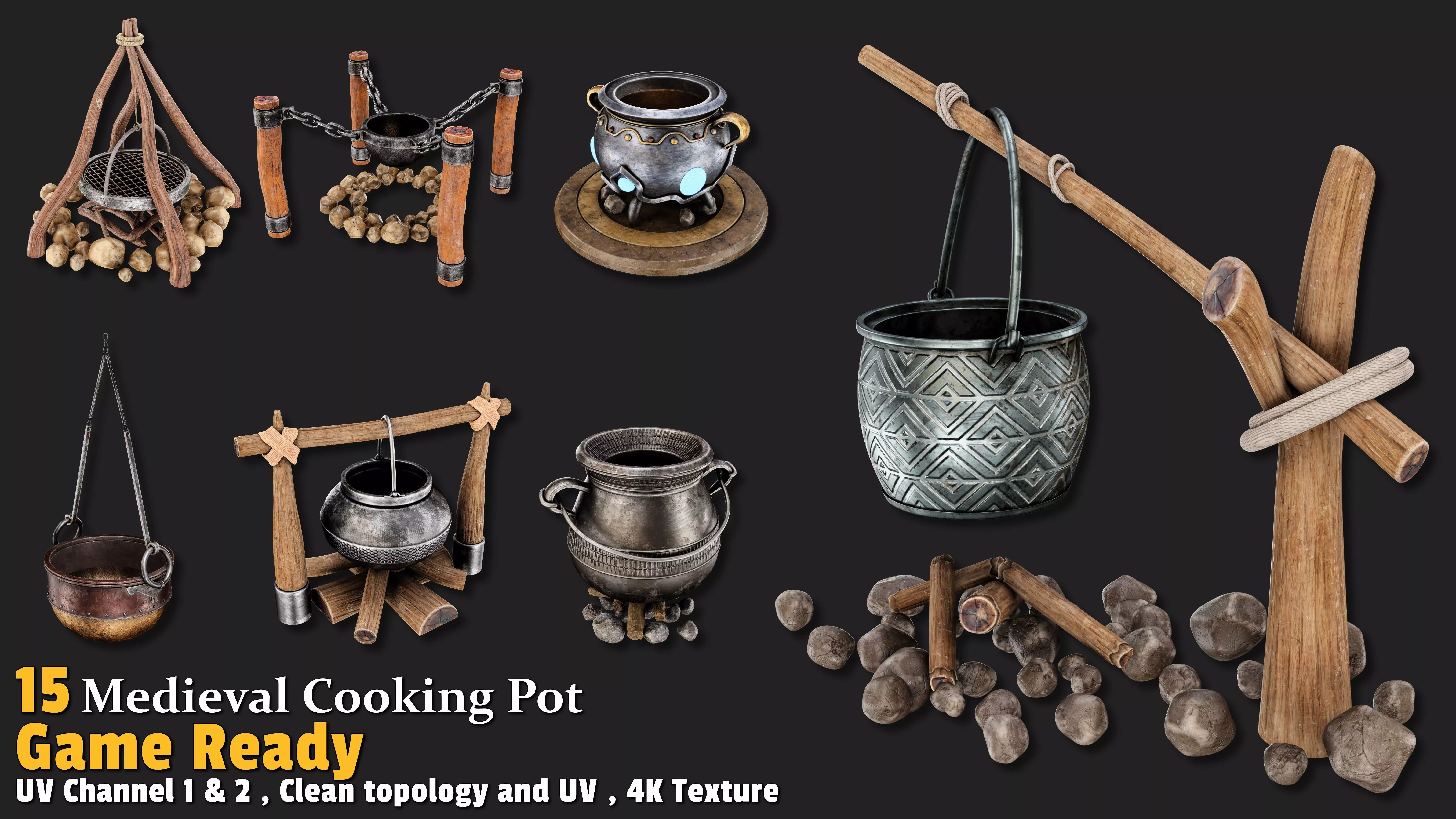 This set includes 15 unique cauldron models, perfect for forest scenes, castle kitchens, or adventurous camps. Each model is UV-unwrapped (Channels 1 & 2) with 4K textures, ready for your custom touches.