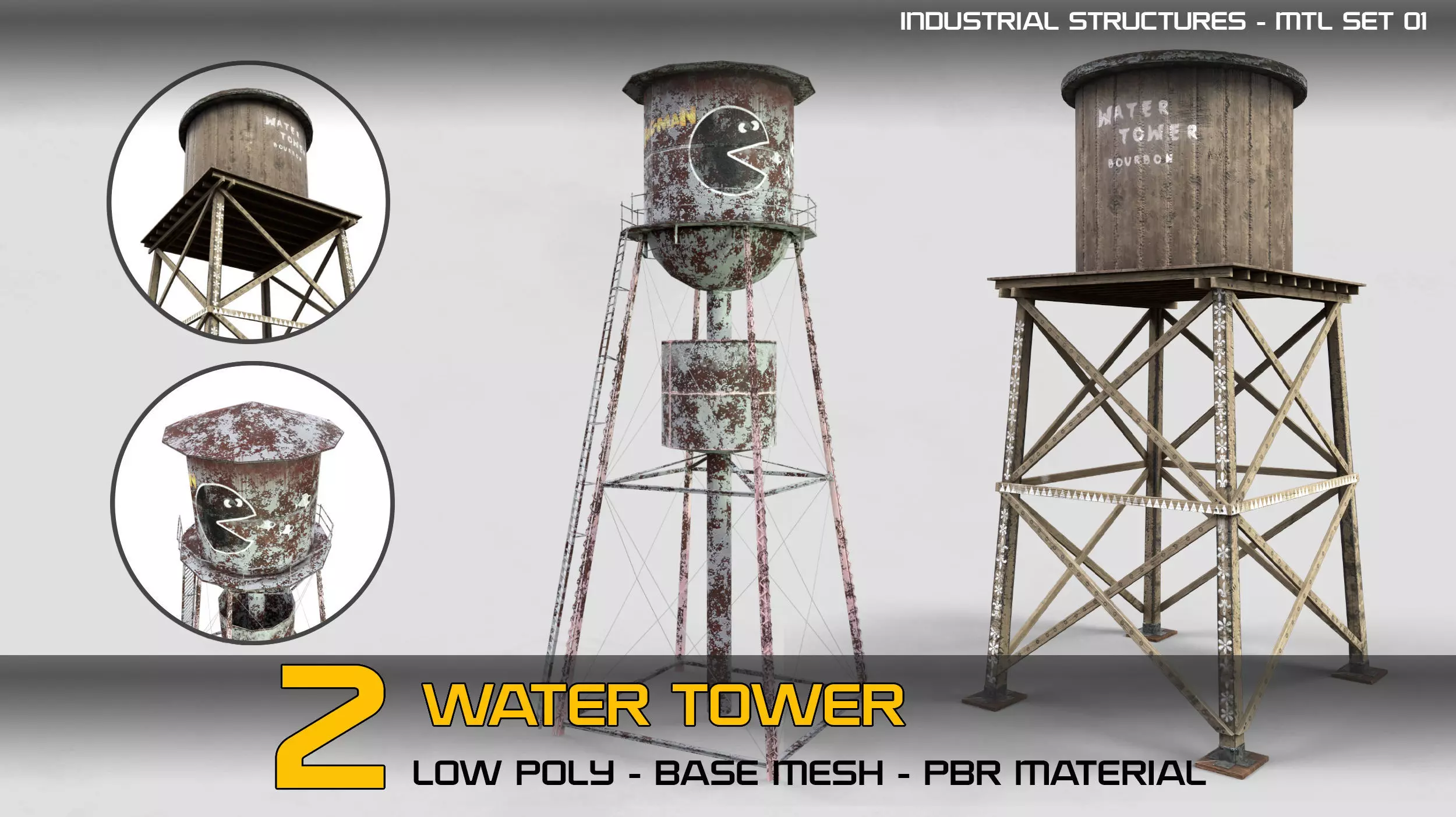 Industrial Structures- mtl set 01 (Game Ready-Low Poly)This pack is the first material set of our second industrial structures series, 20 water tower,contained two 3d models which are provided for you to be used in your gaming projects, industrial and urban and architectural scenes and renders. you can also use various part of each model in your conceptual projects and modeling. From now on, you can have these two models with PBR material in your library. The products are modeled with clean topology, UVs, ready for baking and each of them is ready to be subdivided. each product is low poly and can be easily used in game engines.