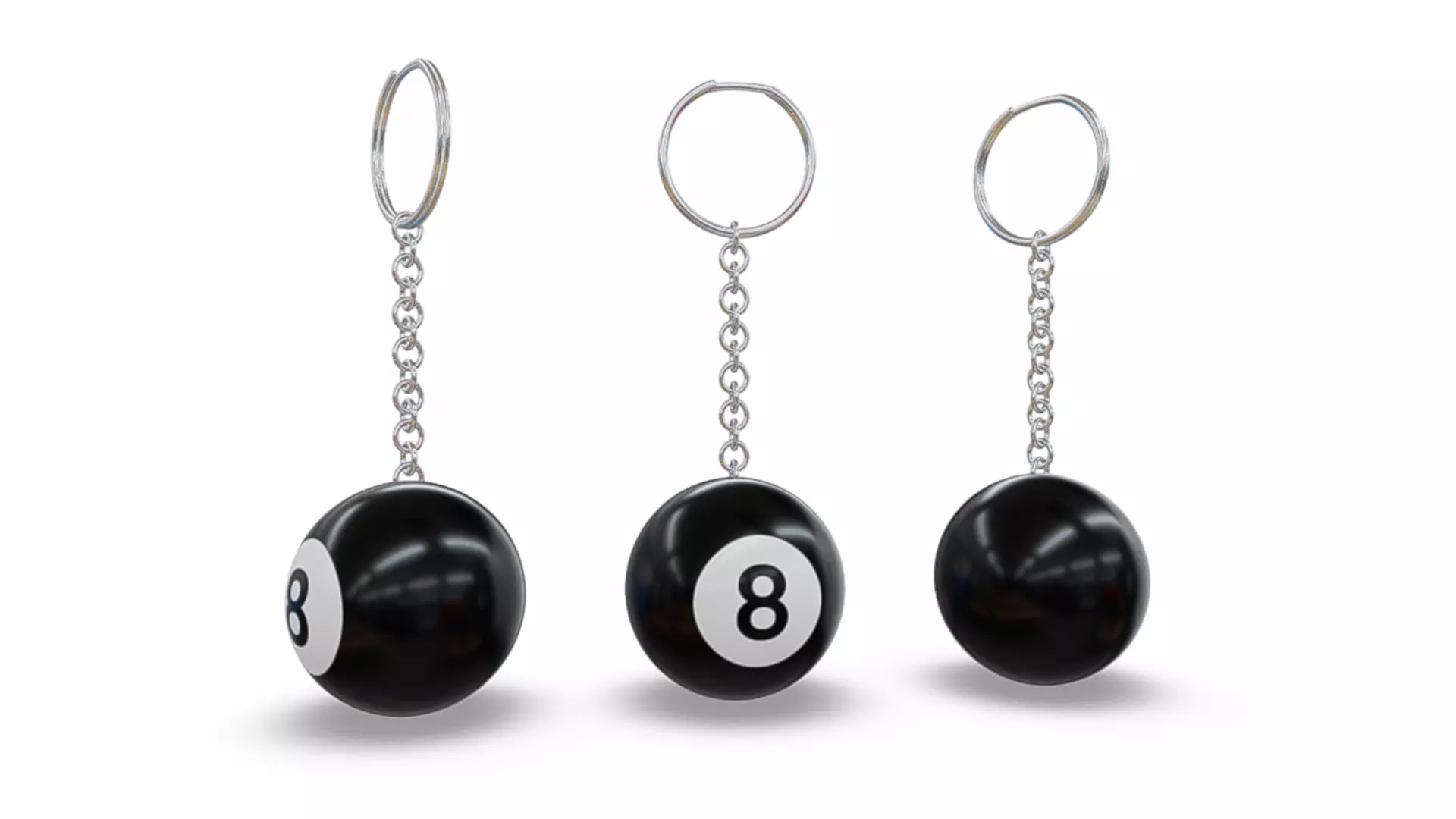 High-quality 3D model of a classic billiard 8-ball keychain featuring a glossy black sphere with a white number panel and realistic reflective surface. Includes a detailed metal chain and keyring with polished chrome material. Designed with clean topology and optimized geometry, making it suitable for game engines, product visualization, promotional renders, and merchandise mockups.