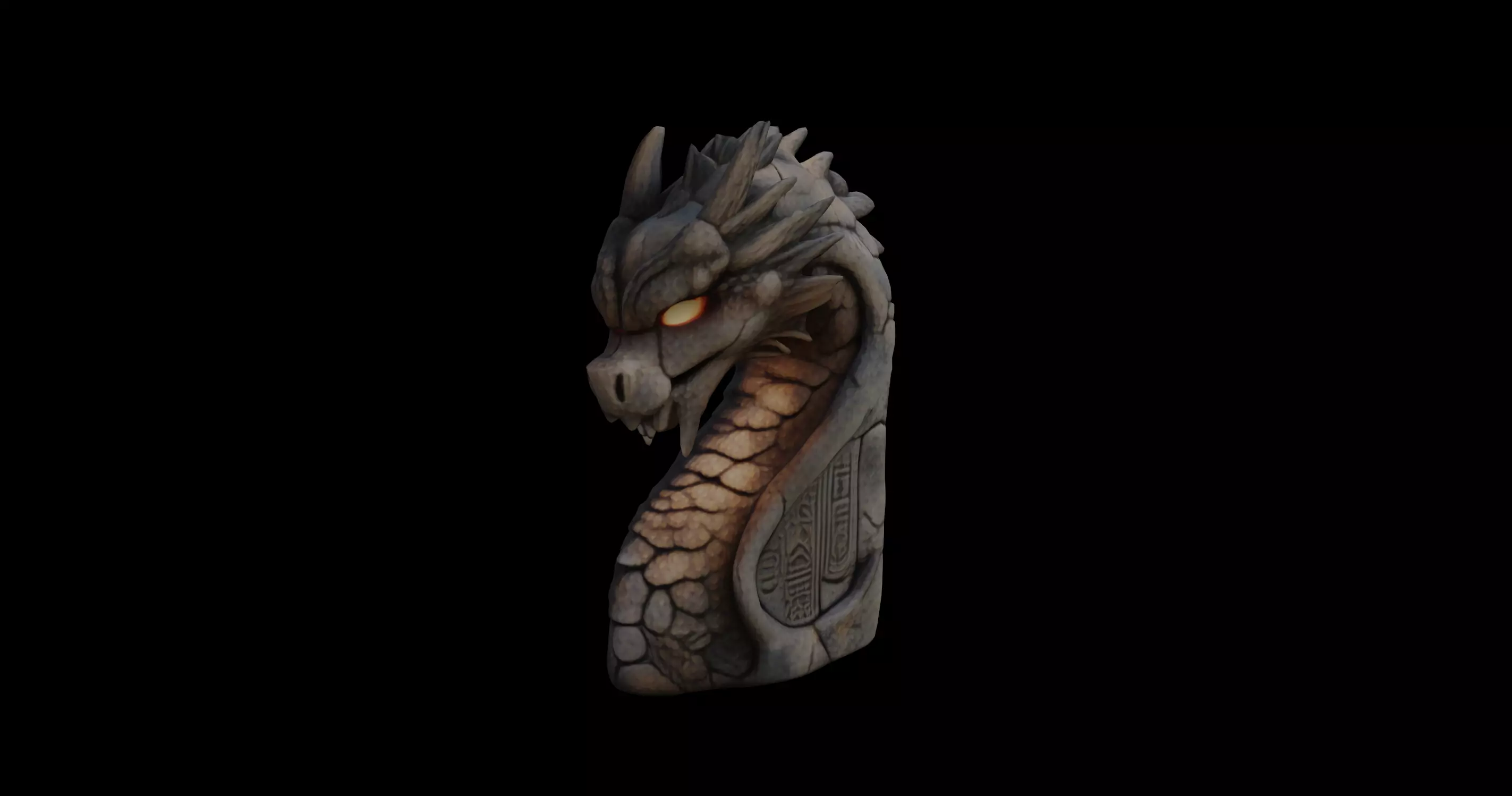 This 3D model showcases an ancient dragon totem intricately carved from weathered stone, evoking the mysticism and grandeur of forgotten civilizations. The dragon's head is highly detailed, featuring sharp ridges, layered scales, and luminous amber eyes that appear to glow with a mystical flame. Its fierce expression and poised stance suggest a protective guardian, eternally watching over sacred grounds.The texture of the model highlights the cracked, aged surface of stone, giving it an authentic, time-worn appearance. The scales along the dragon’s neck are individually sculpted and subtly catch light, emphasizing their curvature and depth. Etched into the base of the neck are enigmatic runes, reinforcing the totem’s ancient and magical origins. These inscriptions appear as sacred markings, perhaps from an extinct language or a long-lost culture steeped in dragon worship.Ideal for use in fantasy-themed environments, games, or animations, this model brings a powerful presence to any digital scene. Its balance of realism and stylization makes it versatile for both high-fidelity renders and stylized fantasy worlds. The glowing eye effect can be further enhanced through shader tweaking or visual effects layers, making the totem feel alive with ancient energy.This 3D model is available for download in .gmb format with texture included. Additionally, it is provided in .fbx format for broader compatibility across platforms and software suites. Whether used as a decorative statue, environmental asset, or magical relic, this dragon totem brings a strong mythological essence to any creative project.