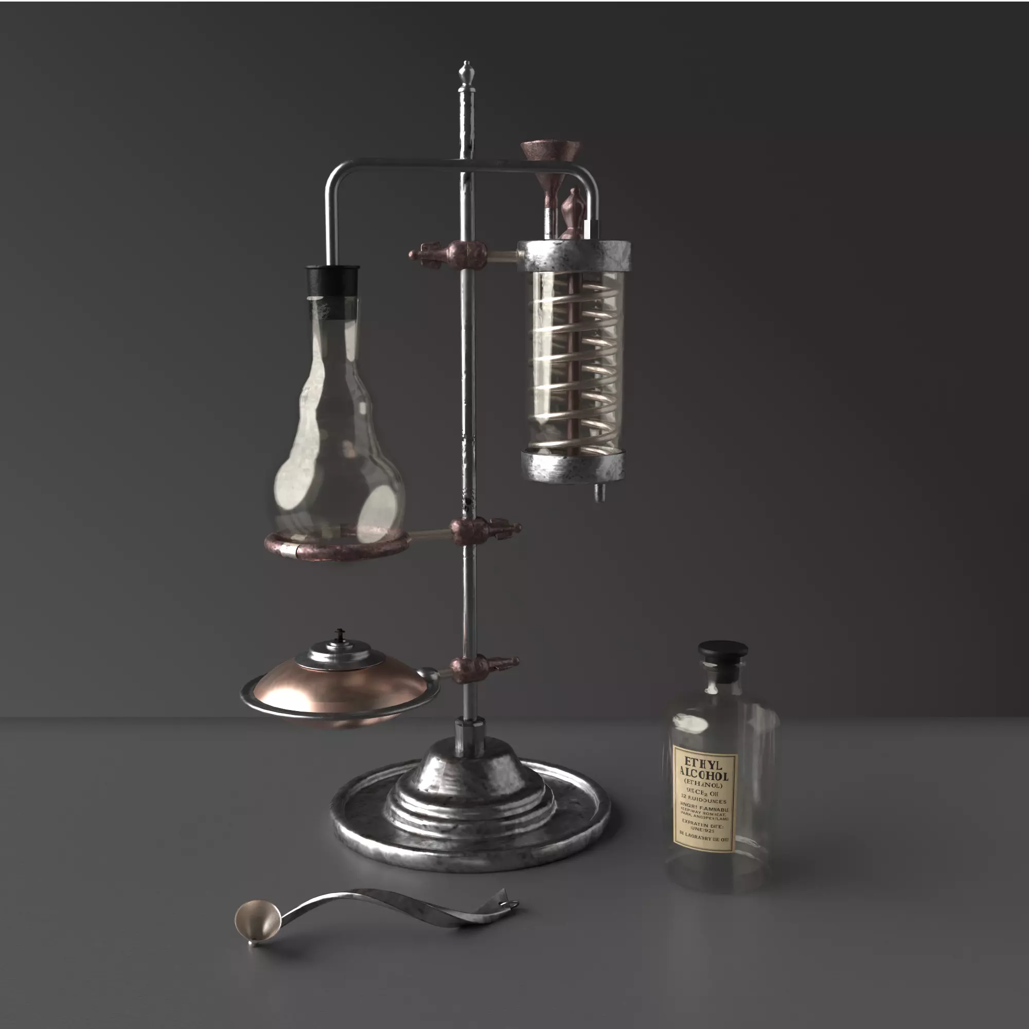 This model represents a classic laboratory setup used for the process of distillation—featuring a glass boiling flask, spiral condenser, and metal heating element, all mounted on an aged metallic stand. An additional glass bottle labeled Ethyl Alcohol and a sculpted spoon add to the realism and storytelling potential of the scene.