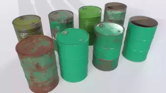 Pack of green colored metal barrels. Comes with 3 different barrels each one with different textures sets, new, used, rusty... for a total of 8 barrels.