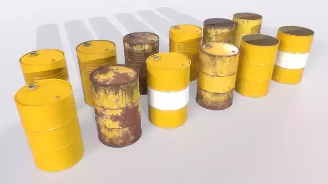 Pack of yellow colored metal barrels. Comes with 3 different barrels each one with different textures sets, new, used, rusty... for a total of 12 barrels.