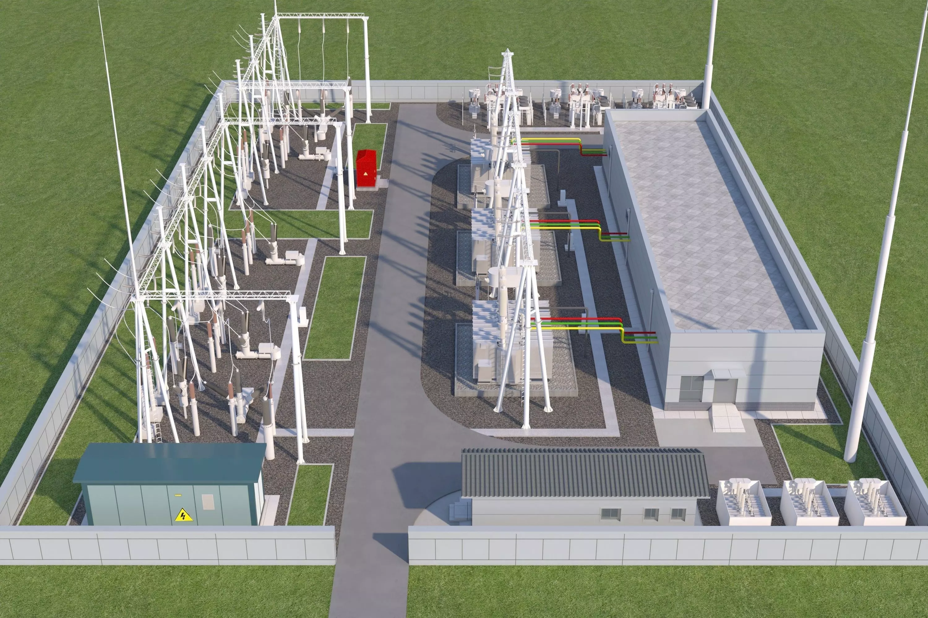This is a 3D rendering of a modern substation with a neat layout, consisting of primary equipment such as high-voltage transmission structures and main transformer banks, as well as auxiliary equipment including relay protection and reactive power compensation devices. Electrical energy is transmitted and transformed through red, yellow, and green three-phase busbars. The site is also equipped with supporting buildings like a main control room, auxiliary rooms, and distribution kiosks, enclosed by fences with clear zoning of internal roads and green areas, collectively undertaking the functions of high-voltage power transformation, distribution, monitoring, and protection.