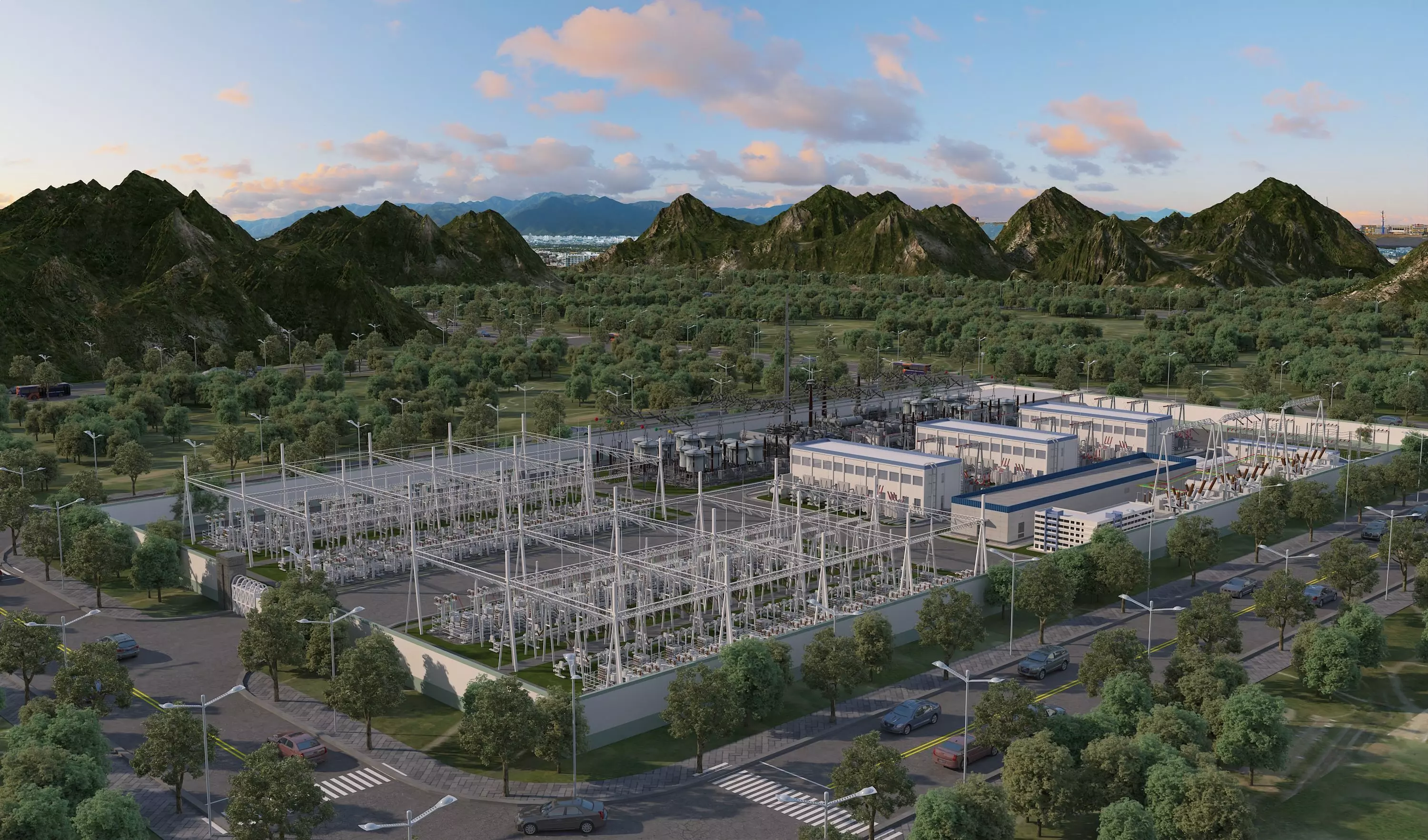 This is a 3D rendering of a large-scale substation nestled among mountains and near water. Enclosed by perimeter walls, it is backed by layered green mountains and dense woodlands, with clean roads and lush trees surrounding the site, and a distant view of a city and water body. The neatly laid-out site features densely arranged primary equipment such as high-voltage transmission structures, circuit breakers, and disconnectors, alongside multiple main control and power distribution buildings. High-voltage power is accessed, transformed, and distributed through complex conductors and busbars, showcasing the industrial character of a large hub substation that undertakes the core functions of power dispatch and transmission for the regional power grid.