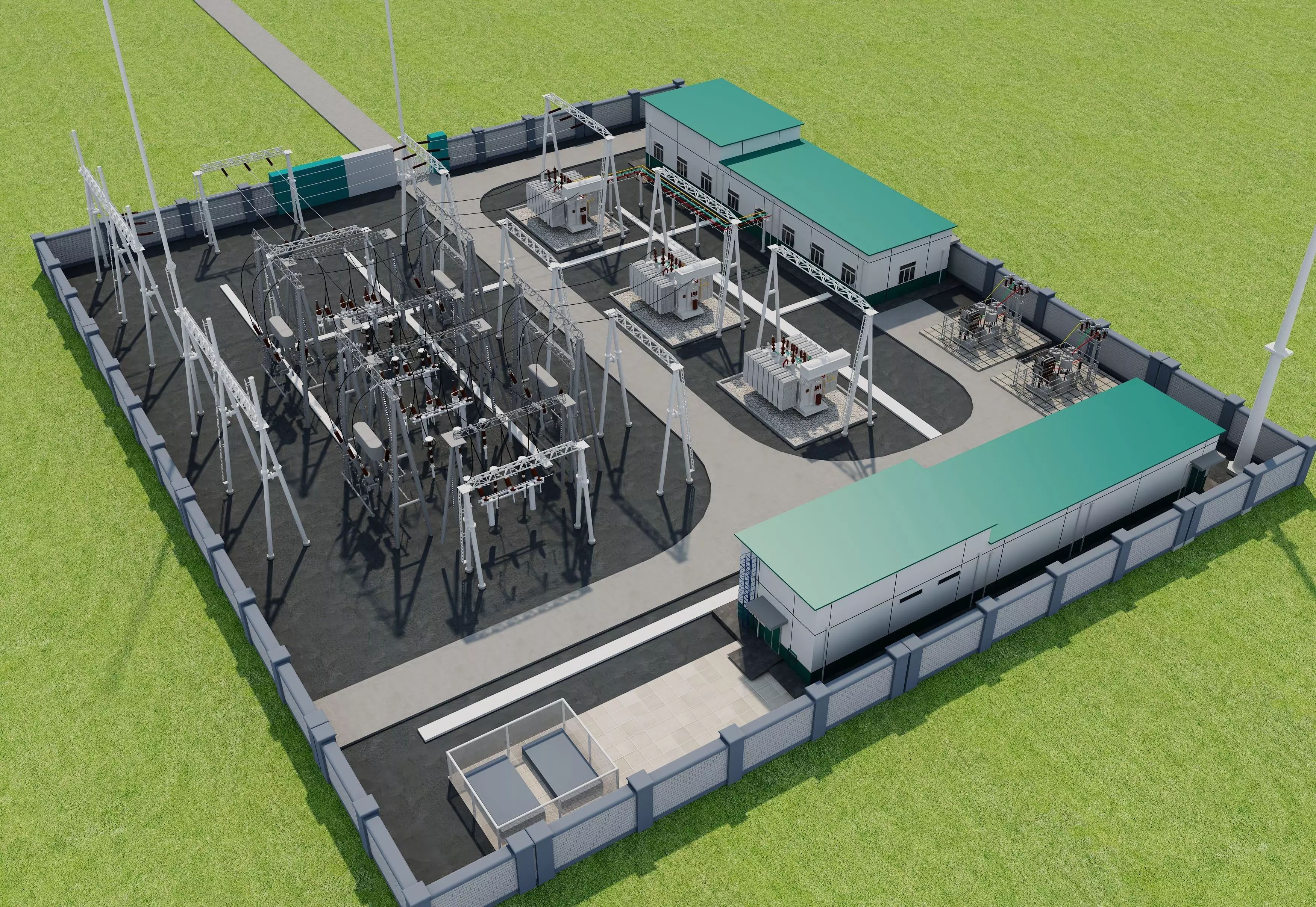 This is a neatly laid-out 3D rendering of a substation, enclosed by gray fences. The core area houses primary equipment such as high-voltage transmission structures, circuit breakers, and disconnectors, along with multiple main transformers and reactive power compensation devices. High-voltage power is accessed, transformed, and distributed via busbars and conductors. Supporting facilities include green-roofed, white-walled main control rooms, auxiliary rooms, and a long distribution building, with clear internal road zoning and lightning rods for lightning protection, collectively fulfilling the core functions of power transformation, monitoring, and protection.