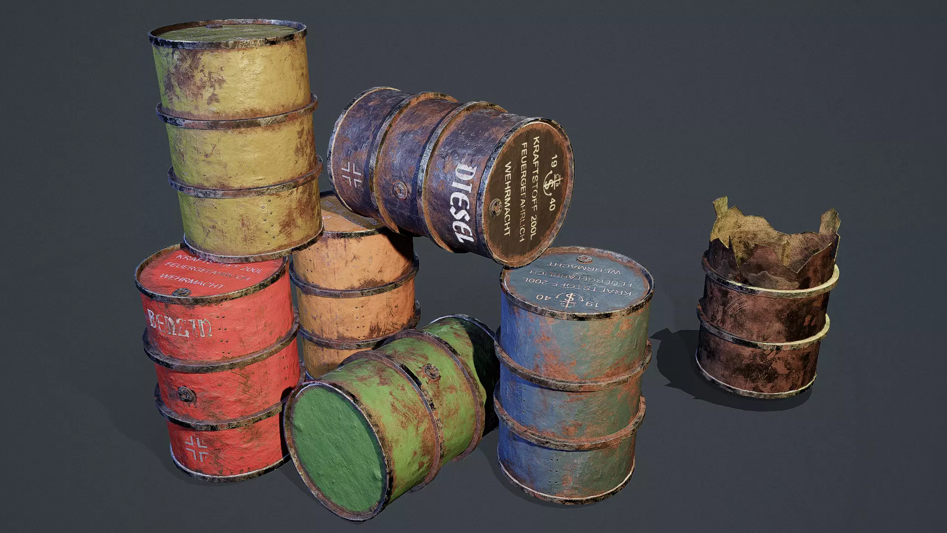 AAA - game ready asset (first / third - person)one barrel - 1508 tris / all 7 barrels 9930 - tris1 set 2048px for UE5 textures ( Dif/Norm/OclRouMet)