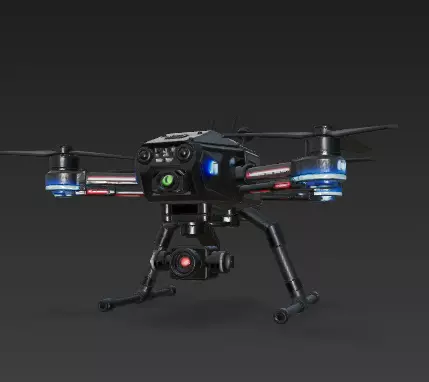 This 8K ultra-high-definition rendering captures a cutting-edge quadcopter drone crafted with a sleek matte black carbon fiber body. Its aerodynamic design features angular edges, four high-performance brushless motors with carbon fibre propellers, and retractable landing gear equipped with shock absorbers. A high-resolution camera gimbal is mounted beneath for aerial imaging, while LED navigation lights in blue and red enhance visibility. Glowing status indicators and an advanced front-facing sensor array highlight its next-gen capabilities. Realistic surface wear and weathering bring authenticity to the photorealistic materials, set under dramatic lighting that emphasises the exposed carbon fibre weave and technical precision