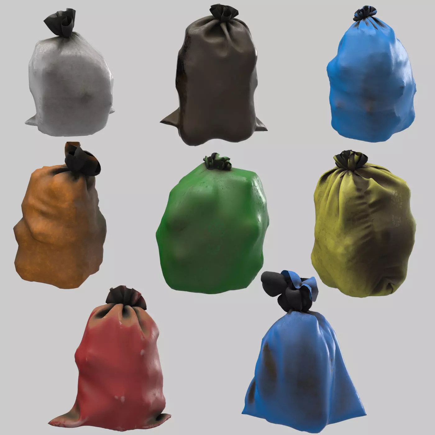 Highly quality Garbage dusty bags multi color PBR 3d model. All objects have one material with one UV map, which is very optimal for use in the any engines