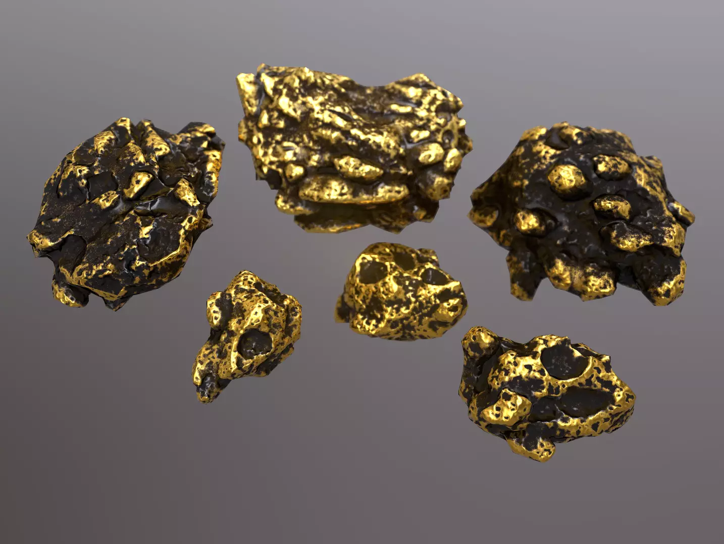 Six gold nuggets 3d models, PBR, Low-poly, game ready. Highpoly models included: Each model is textured with 2048x textures in PNG format. Previews rendered in Marmoset and Unity engine.Unity 2019.4.f1 scene included (unitypackage)
