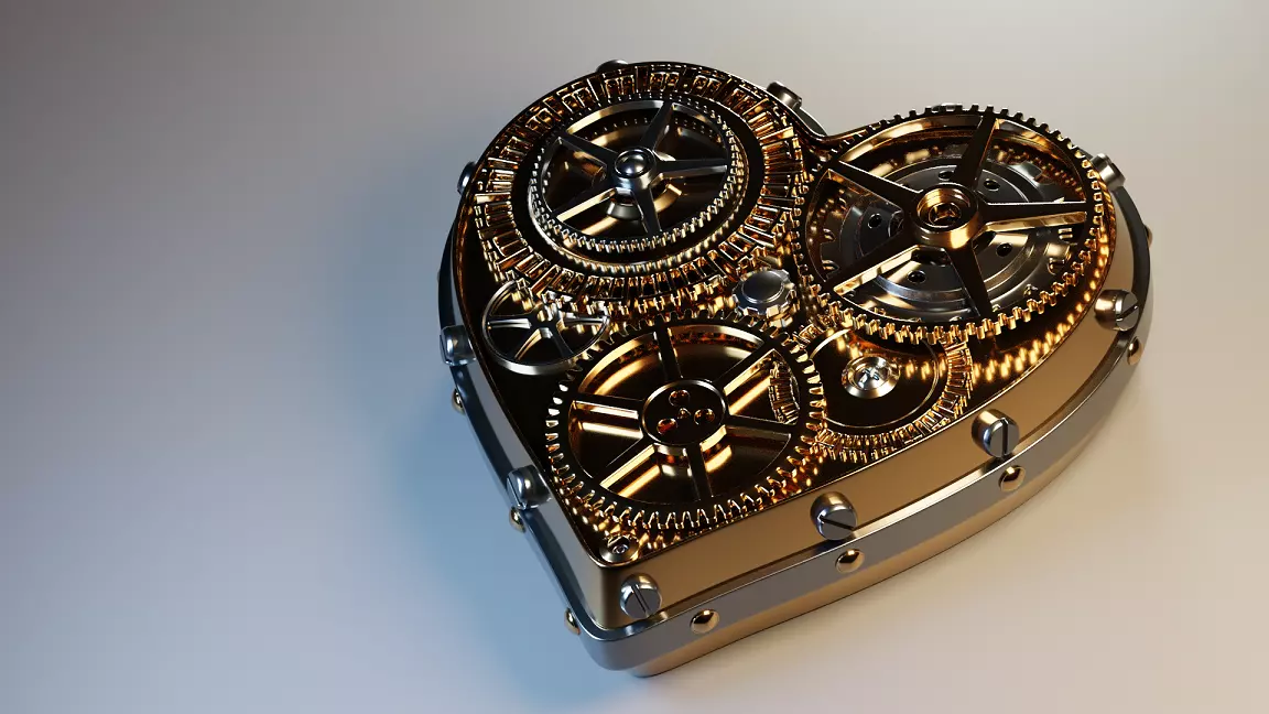 • heart model (separate meshes joined in 1 object) with 2 types simple materials (yellow metal and steel). No UV