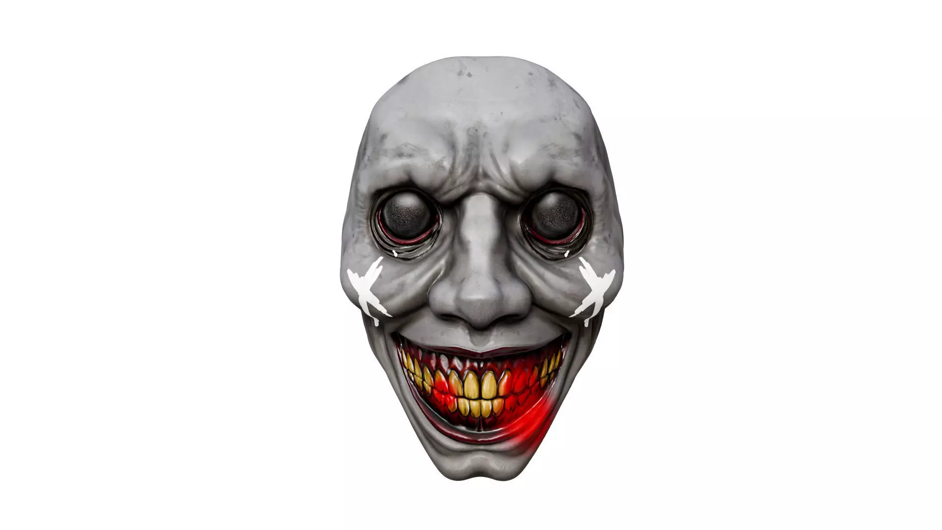 This is a gray creepy smiling mask with white X-shaped marks on the cheeks, black pupils with red rings around the eyes, and yellowish teeth with blood effects. It has a terrifying and eerie style, often used for Halloween, horror-themed cosplay, or film props.