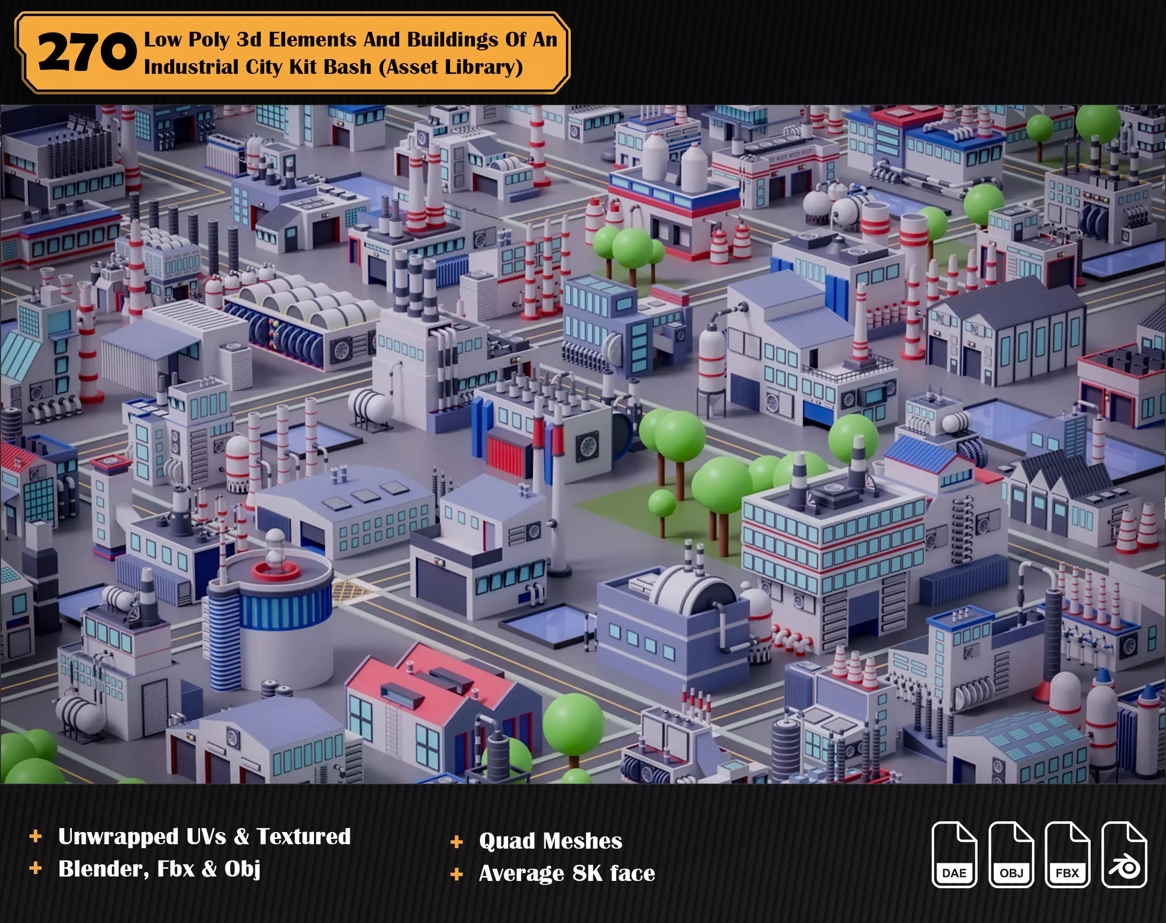 Create your Industrial Cities with a few mouse clicks.A package of 270 low poly 3D models of Industrial Objects with one material (Texture) in Blender software.