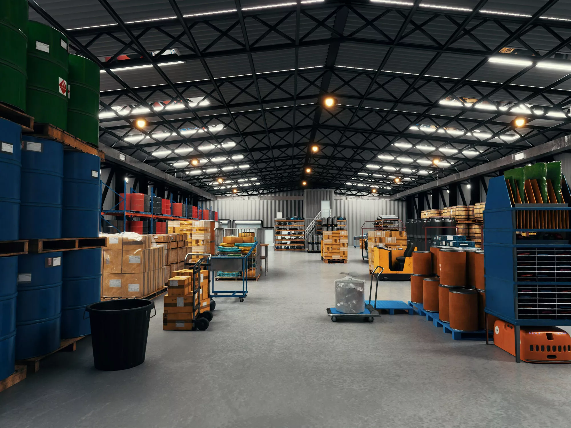 Professional high-quality 3D complete scene of an Industrial Warehouse and Logistics Distribution Center meticulously crafted for large-scale manufacturing visualization smart logistics planning and supply chain simulation projects. This massive environment features a comprehensive storage layout including heavy-duty steel truss roofing industrial chemical drums stacked palletized cargo logistics sorting robots manual handling carts and professional high-bay lighting systems with realistic PBR materials.