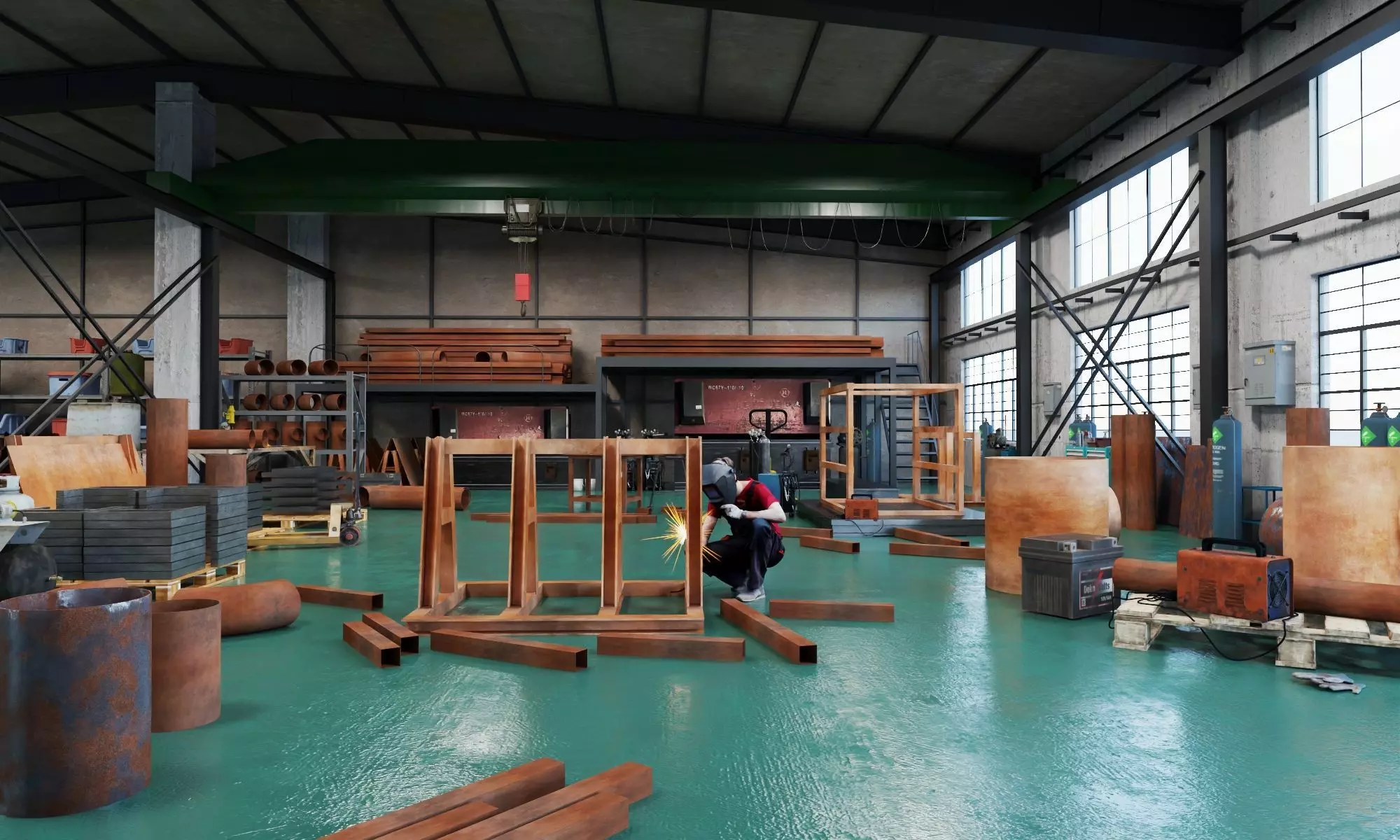 High-quality pack of industrial workshop and welding factory interior 3D models, featuring: large steel truss ceiling with overhead crane rails, heavy steel beams/pipes storage, welding workstations with sparks/equipment, metal fabrication frames, oxygen/acetylene tanks, workbenches, tool carts, green epoxy flooring, and detailed heavy industry props.Models built to real-world scale with high detail — realistic rust/patina on metal, concrete/grit textures, emissive welding sparks, rubber hose details, subtle dust/grime accumulation, bright industrial lighting, and authentic metalworking/factory realism.Full PBR workflow with high-res textures (2K-4K): Albedo, Roughness, Metallic, Normal, AO maps for realistic metal corrosion, concrete roughness, emissive glow, surface variation, and depth in any lighting.Ideal for:• Architectural visualization and factory renders• Industrial workshop, metal fabrication, and manufacturing facility builds• Heavy industry and welding simulation scenes• Game assets (Unity/Unreal ready)• VR/AR factory tours and safety training experiences• VFX, promotional videos, engineering visualizationOptimized polycount for real-time — drag and drop to enhance scenes instantly.Compatible formats:MAX (with materials), OBJ, FBXCompatible with 3ds Max, Maya, Blender, Cinema 4D, Unity, Unreal Engine, and more.