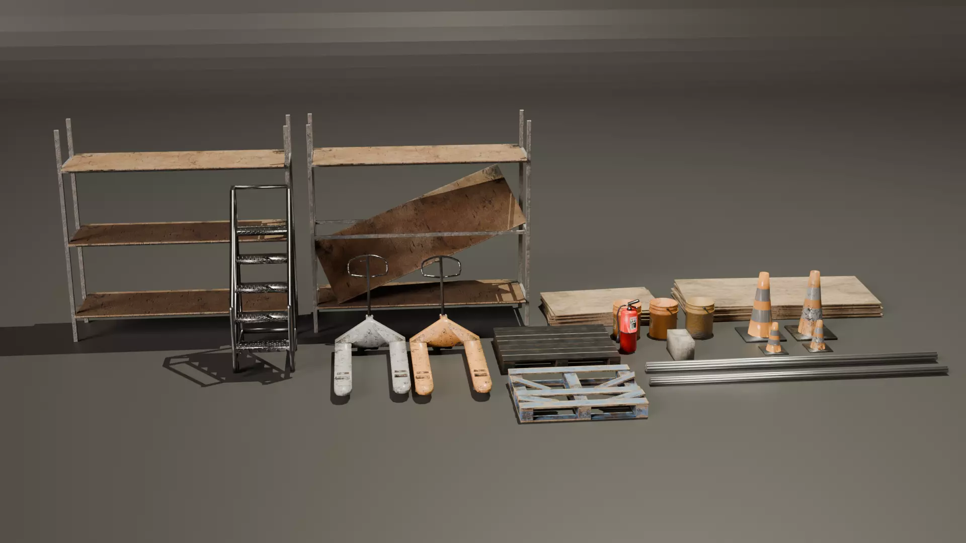 This is a Low poly industrial Pack contains, 2 Palet jacks, Ladder, 2 variations of shelves, 2 variations of palets, 4 variations of cones, 3 variations of 5gal buckets, 2 variations of wood stacks, 2 variations of pipe, fire extinguisher, and a cinder block.
