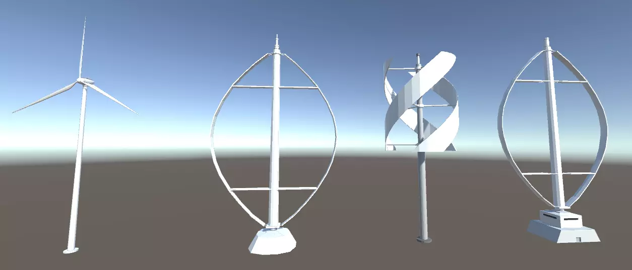 a collection of low-poly wind turbines / windmill power plantsstandard and vertical wind turbines includedideal for video gaming use (stylized, lowpoly, strategy, simulation, topdown,rts, etc)