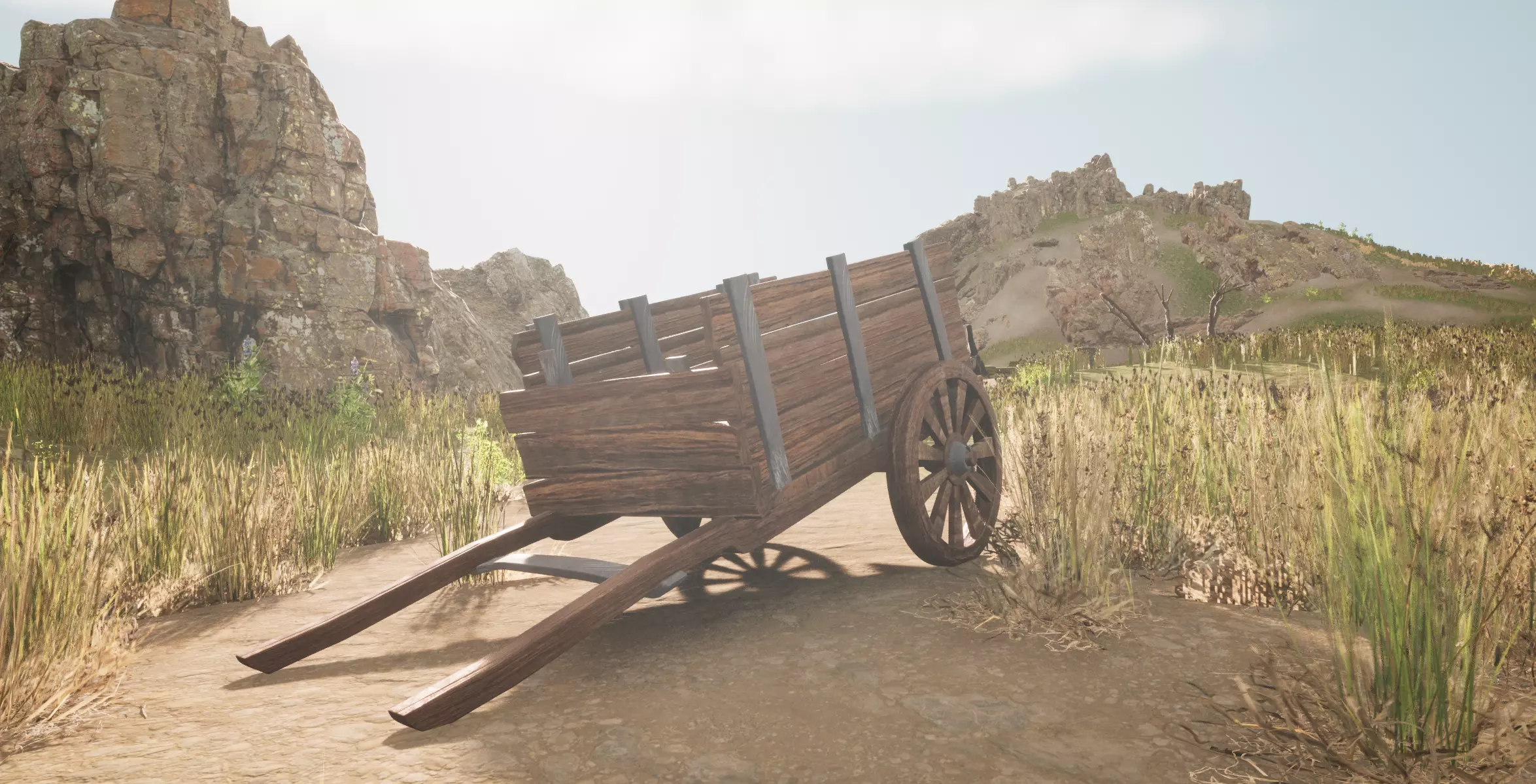 low poly 3D model of an old cart created in blender, texturing also in blender (preview picture created in anrial engine 5)The model has 2 textures Texture of metal and wood (texture taken from the bridge)