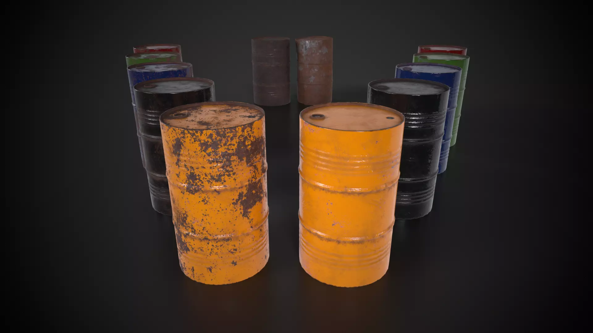 model 1 - ordinary metal barrel without damage (tris: 1020, verts: 512)This model have 11 different textures( black, black+rust, blue, blue+rust, green, green+rust, red, red+rust, yellow, yellow+rust and all rust)