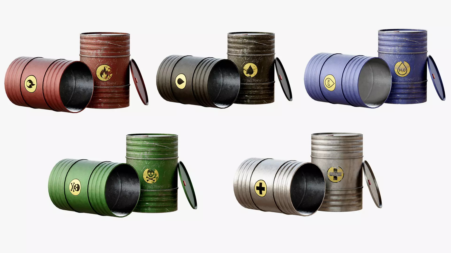 5 Barrel Types (Flammable/Red, Oil/Black, Water/Blue, Toxic/Green, Medical/Metal)