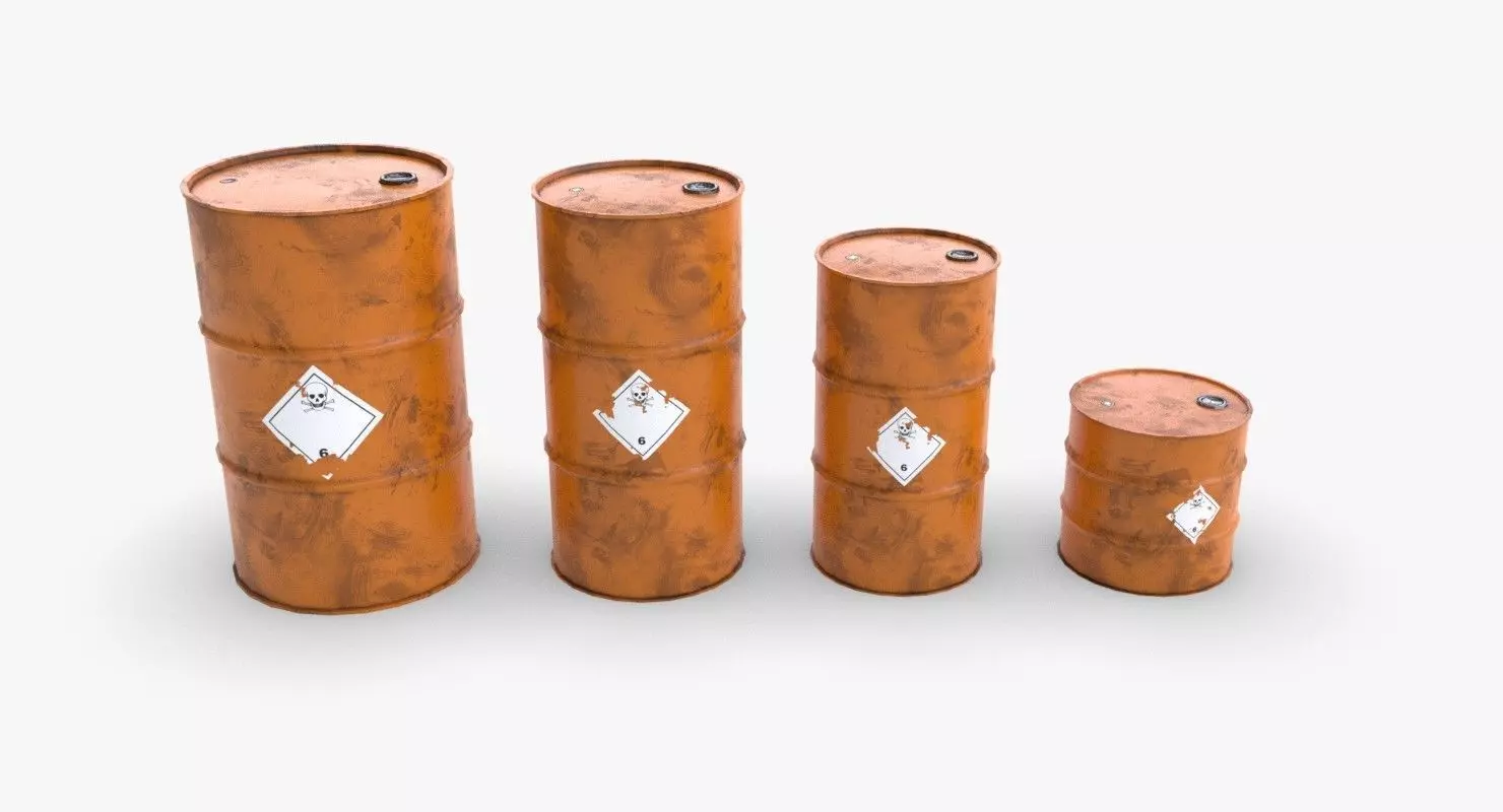 A model of 4 metallic barrels. The model is ready for game and include 3 LODs and a single material for each variation. It is available in a single object for each variation and each LOD. The material represent a orange painted version with a toxic sign sticked on it. The variations of size are :