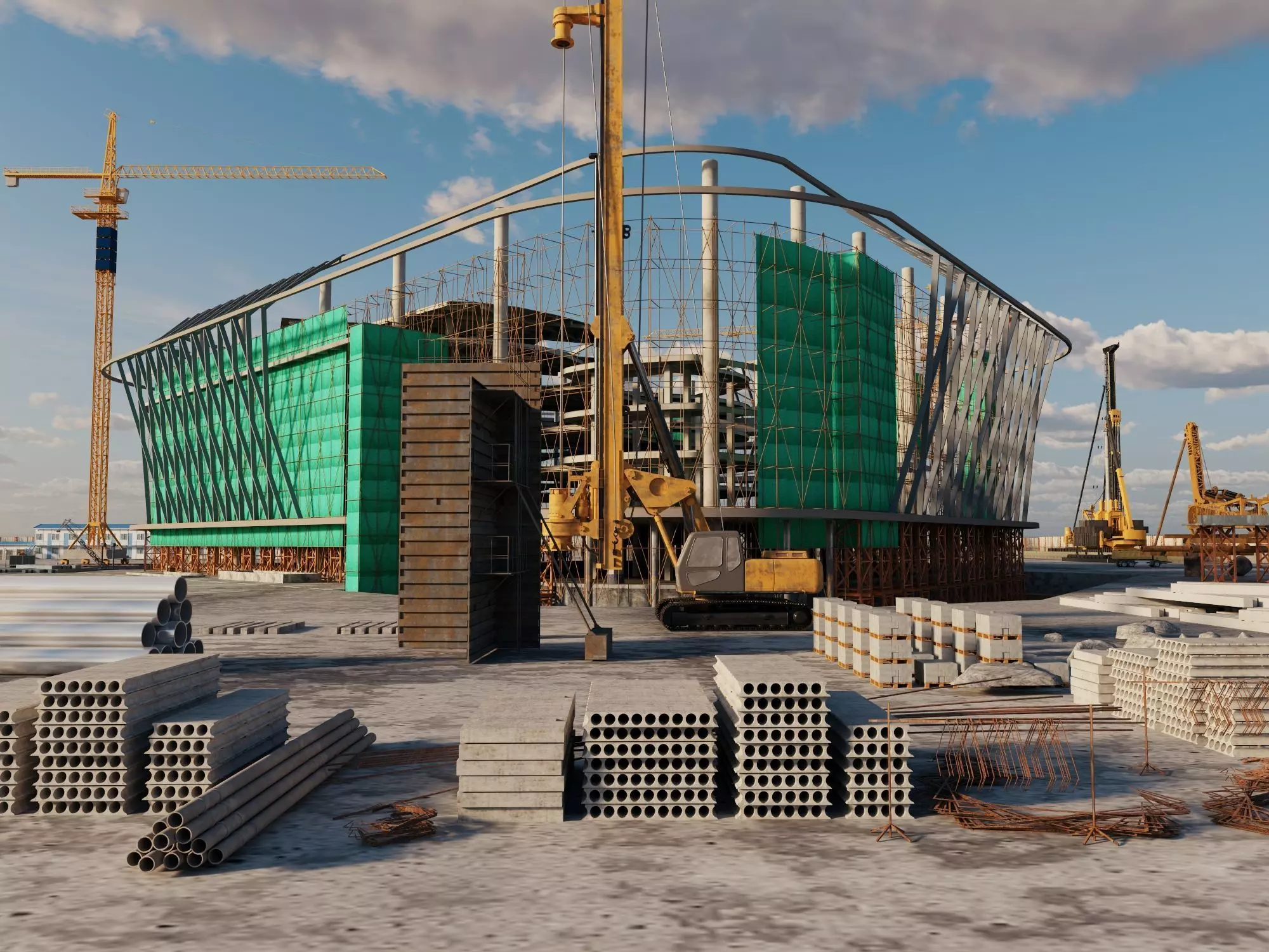 Experience a comprehensive, production-ready construction environment with this highly detailed 3D mega scene. This collection features a massive stadium-style structure under development, complete with professional-grade safety netting, scaffolding, and structural columns. The scene is fully populated with specialized heavy machinery including a tower crane and a hydraulic rotary drilling rig, alongside a vast array of building materials like precast concrete slabs, steel pipes, and rebar piles. Perfect for civil engineering visualizations, real estate marketing, and industrial training simulations.