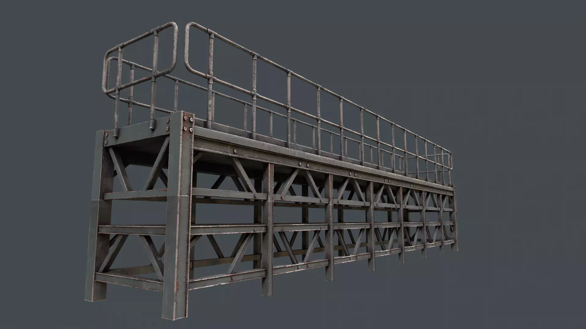This is a highly detailed industrial metal walkway platform featuring realistic guardrails and sturdy steel framing. The model is designed with a worn, slightly rusted appearance, ideal for industrial environments, factories, refineries, or post-apocalyptic scenes.