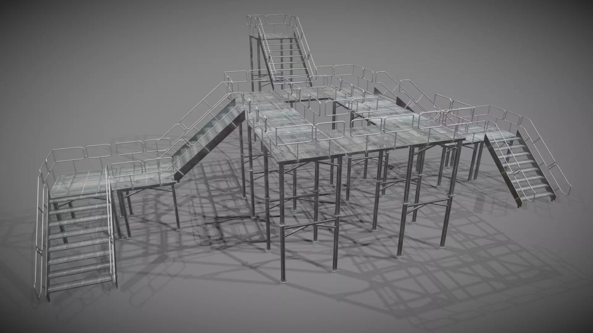 1 set of stairs at 1512 tris 2 sets of walkway at 448 tris each 2 sets of straight handrails at 524 tris each 2 sets of corner handrails (inner and out corners) at 1000 tris 1 set of 4 posts at 112 tris 1 set of 2 beams at 48 tris