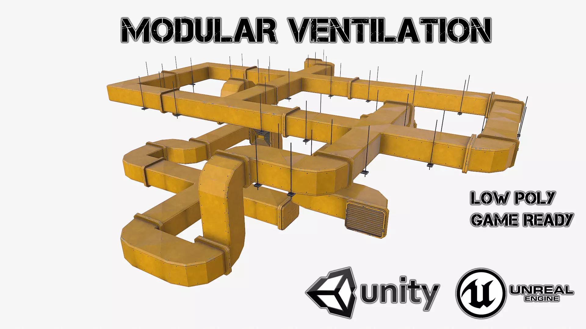 Included ZIP & RAR file formats: -mb -fbx -dae -obj -TGA Low poly: 14064 tris (25 models) TEXTURES: Ventilation_yellow_AOVentilation_yellow_DMVentilation_yellow_HMVentilation_yellow_HMVentilation_yellow_NMVentilation_yellow_RM All models have only one set of textures (4096x4096).Your game will be beautiful and optimized at the same time! 25 models will be available to you. You can create the configuration that is right for you! Fans can be animated. The scene was modeled using Autodesk Maya 2018. All objects are grouped and named correct for easy selection and control. You don't need a special plugin to open the scene. The entire scene was simulated in real scale. This model is scaled for the real world. Measurement units: centimeters. All materials are named correctly. The model includes a ready-to-play texture. It is very easy to work with him.