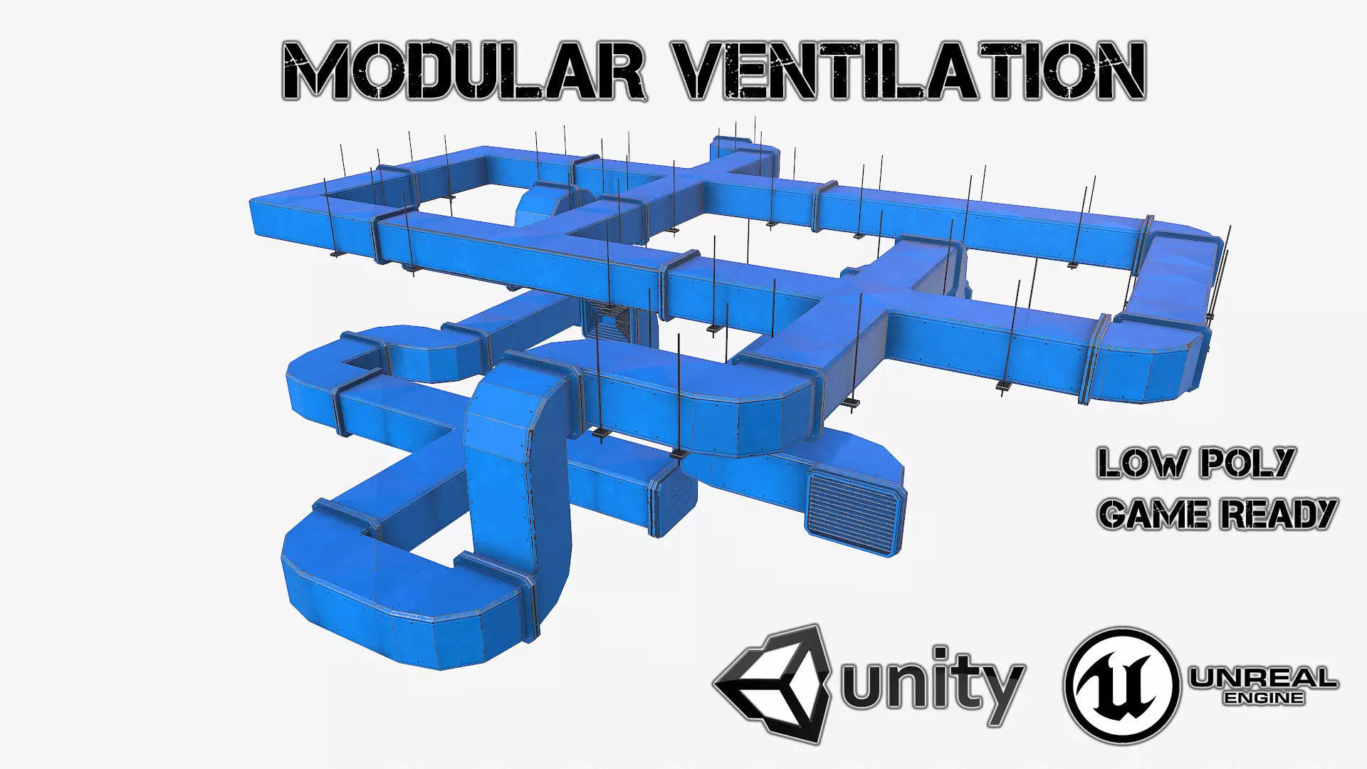 Included ZIP & RAR file formats: -mb -fbx -dae -obj -TGA Low poly: 14064 tris (25 models) TEXTURES: Ventilation_blue_AOVentilation_blue_DMVentilation_blue_HMVentilation_blue_MMVentilation_blue_NMVentilation_blue_RM All models have only one set of textures (4096x4096).Your game will be beautiful and optimized at the same time! 25 models will be available to you. You can create the configuration that is right for you! Fans can be animated. The scene was modeled using Autodesk Maya 2018. All objects are grouped and named correct for easy selection and control. You don't need a special plugin to open the scene. The entire scene was simulated in real scale. This model is scaled for the real world. Measurement units: centimeters. All materials are named correctly. The model includes a ready-to-play texture. It is very easy to work with him.