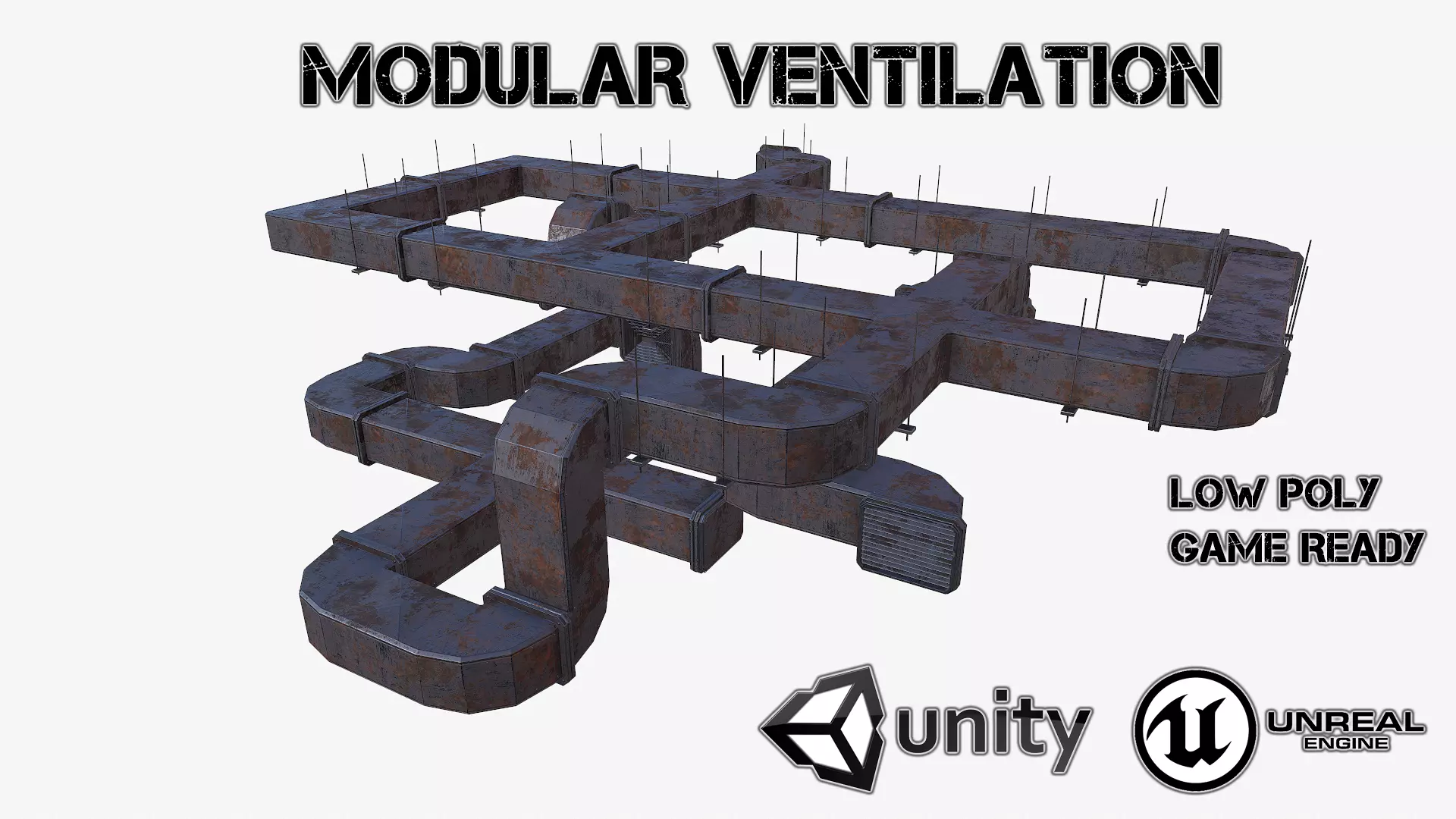Included ZIP & RAR file formats: -mb -fbx -dae -obj -TGA Low poly: 14064 tris (25 models) TEXTURES: Ventilation_metal_rust_AOVentilation_metal_rust_DMVentilation_metal_rust_HMVentilation_metal_rust_MMVentilation_metal_rust_NMVentilation_metal_rust_RM All models have only one set of textures (4096x4096).Your game will be beautiful and optimized at the same time! 25 models will be available to you. You can create the configuration that is right for you! Fans can be animated. The scene was modeled using Autodesk Maya 2018. All objects are grouped and named correct for easy selection and control. You don't need a special plugin to open the scene. The entire scene was simulated in real scale. This model is scaled for the real world. Measurement units: centimeters. All materials are named correctly. The model includes a ready-to-play texture. It is very easy to work with him.
