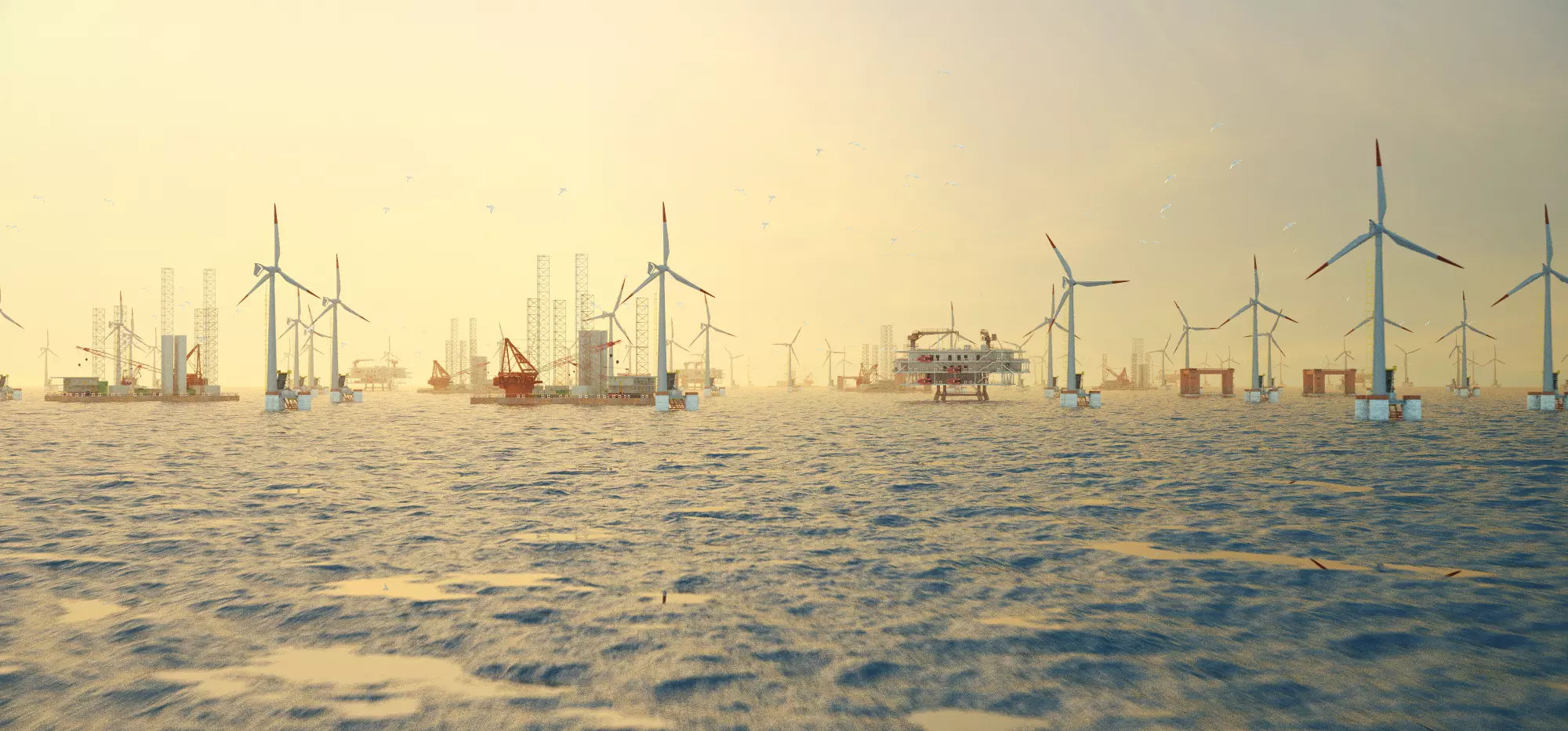 The model includes:Offshore Wind Turbines: Full array of horizontal-axis offshore wind turbines with monopile foundations, nacelles, and rotor blades, complete with access ladders and maintenance platforms.Offshore Substation (OSS) Platforms: Multi-level concrete substation platforms with overhead cranes, safety railings, life rafts, and electrical equipment housings, designed for voltage transformation and grid connection.Construction & Installation Infrastructure: Jack-up construction vessels, pile foundation structures, temporary steel towers, and heavy-lift cranes for wind turbine installation.Marine Environment: Realistic open ocean with dynamic wave textures, seagull assets, and atmospheric lighting for cinematic rendering.