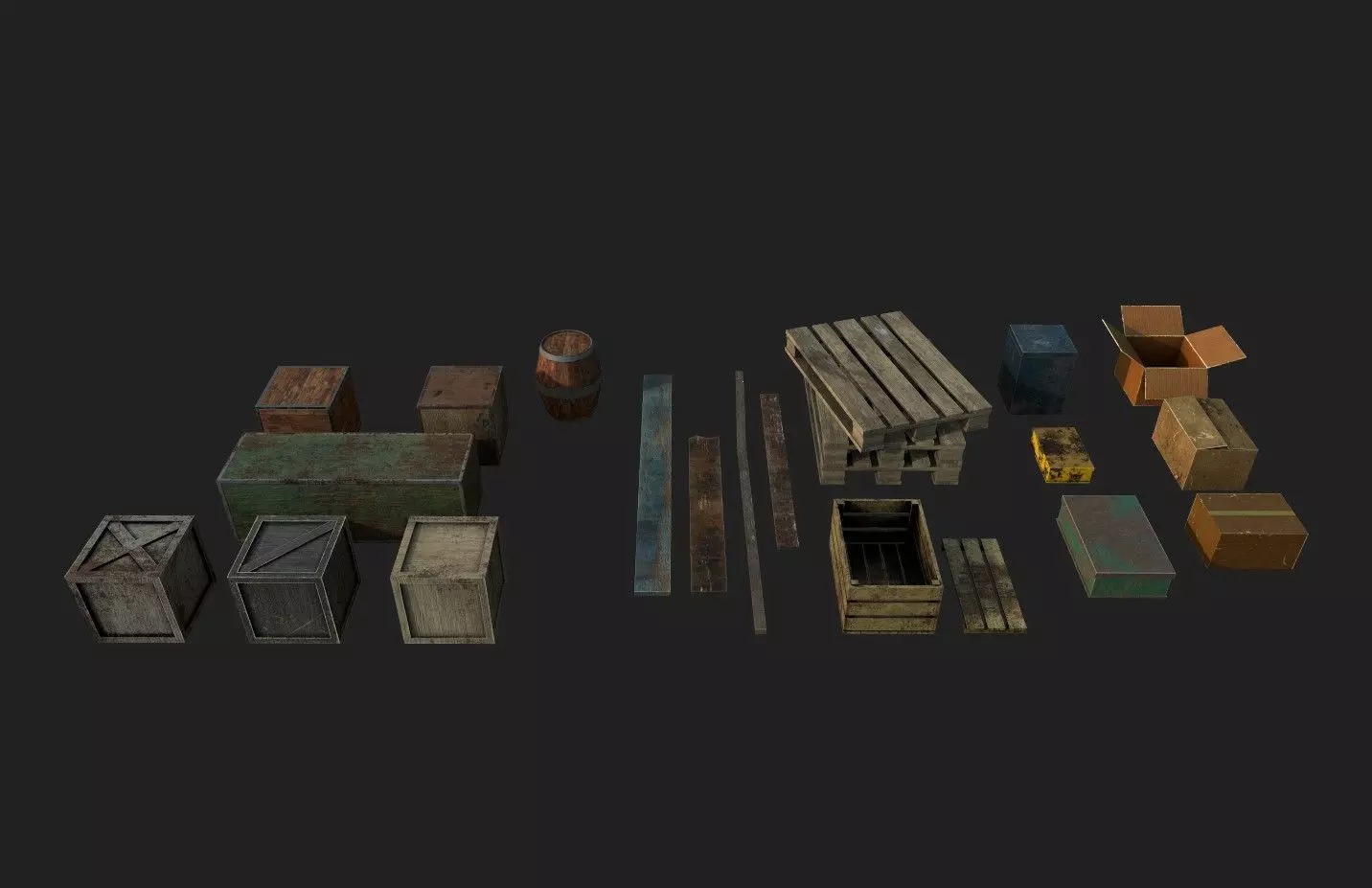 • The pack contains: 6 types of wooden boxes (368 Vertices), one barrel (400 Vertices), 4 planks (52 Vertices), pallets (one pallet with 128 Vertices), casket (208 Vertices), 3 metal boxes (120 Vertices), 3 cardboard boxes (140 Vertices)