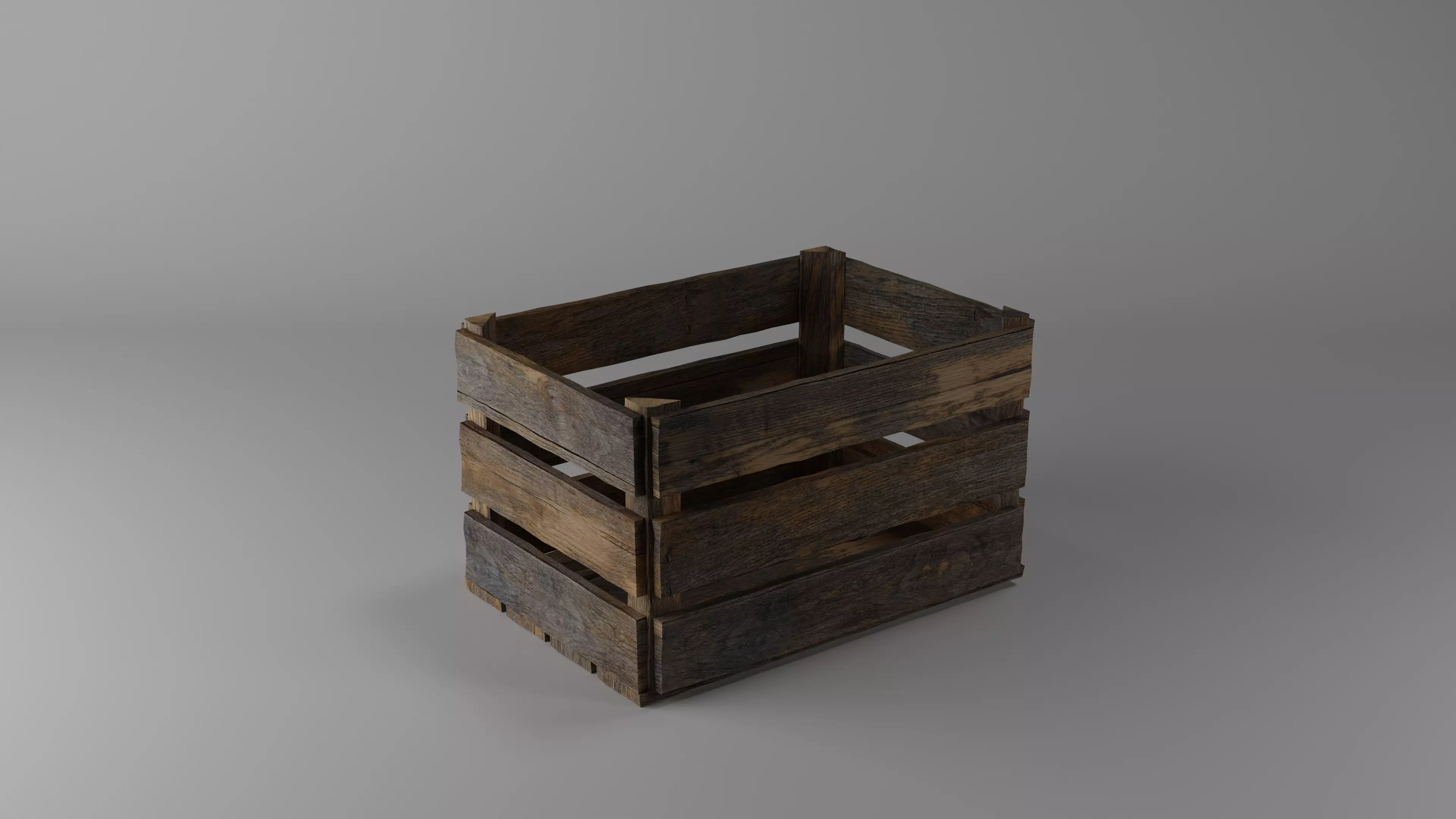A simple, old crate. It would be good for holding fruit, bottles, or other trade goods.Each plank is a seperate body, so if needed, some planks can be removed or hidden to show additional age or damage.Internal space is 50cm long, 35cm wide, and 30cm tall. Planks are approximately 1.25 cm thick, 8cm wide.