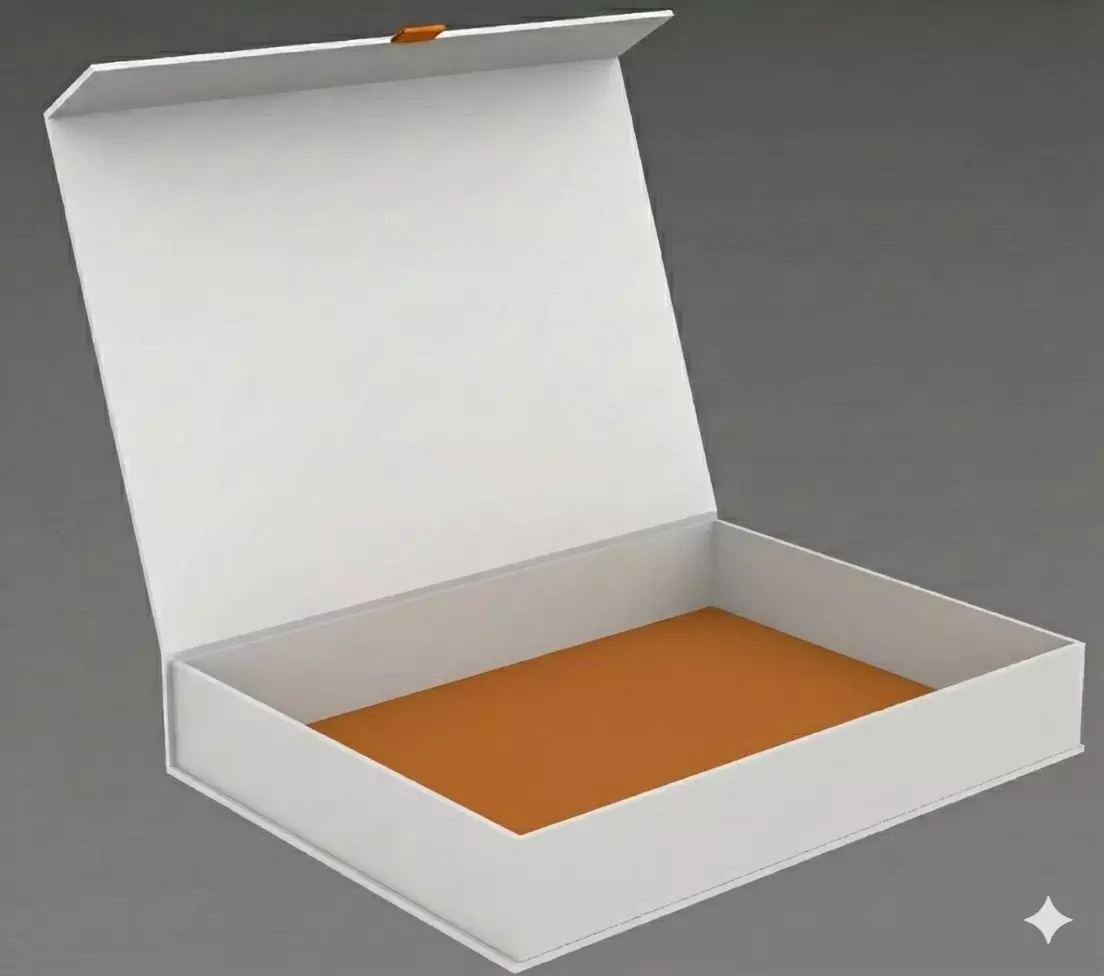 Product Overview: This is a high-quality, photorealistic 3D model of an open magnetic rigid box (flip-top style). Ideal for product packaging visualization, gift mockups, luxury branding, and unboxing animations. The model features a clean white exterior with a vibrant orange interior bottom (Hex #C66B26) and a matching pull-tab ribbon.