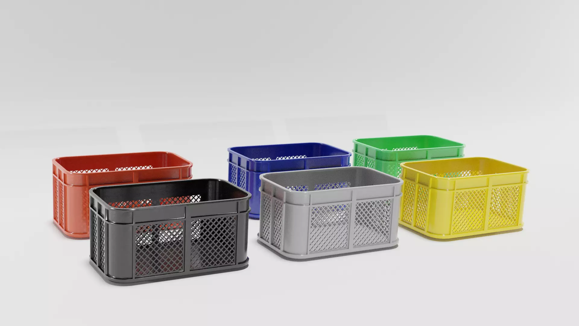 3D lowpoly models of plastic crates in 6 differents colors: red, blue, black, yellow, green and grey.