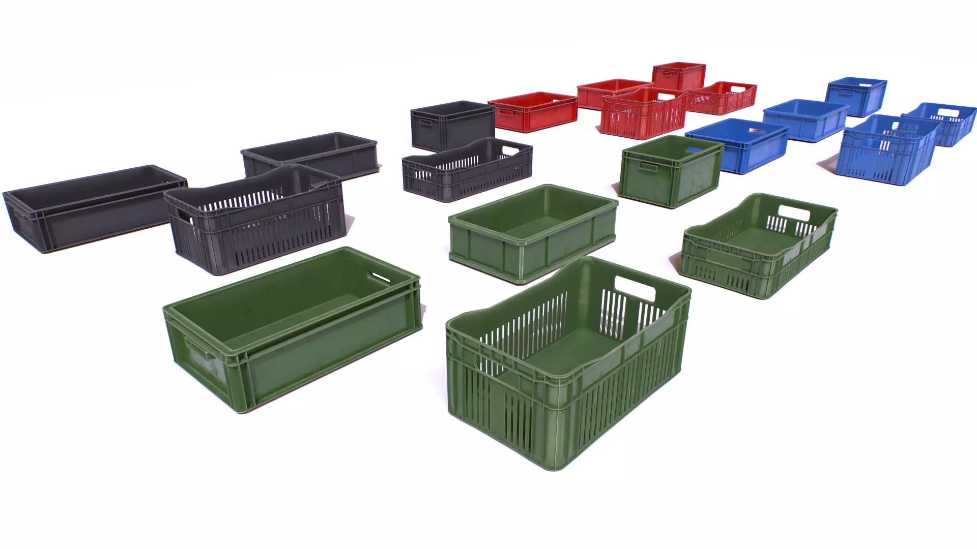 Plastic boxes for products, fruits, vegetables, etc... Based in real ones. Realistic scale. 4 colors.