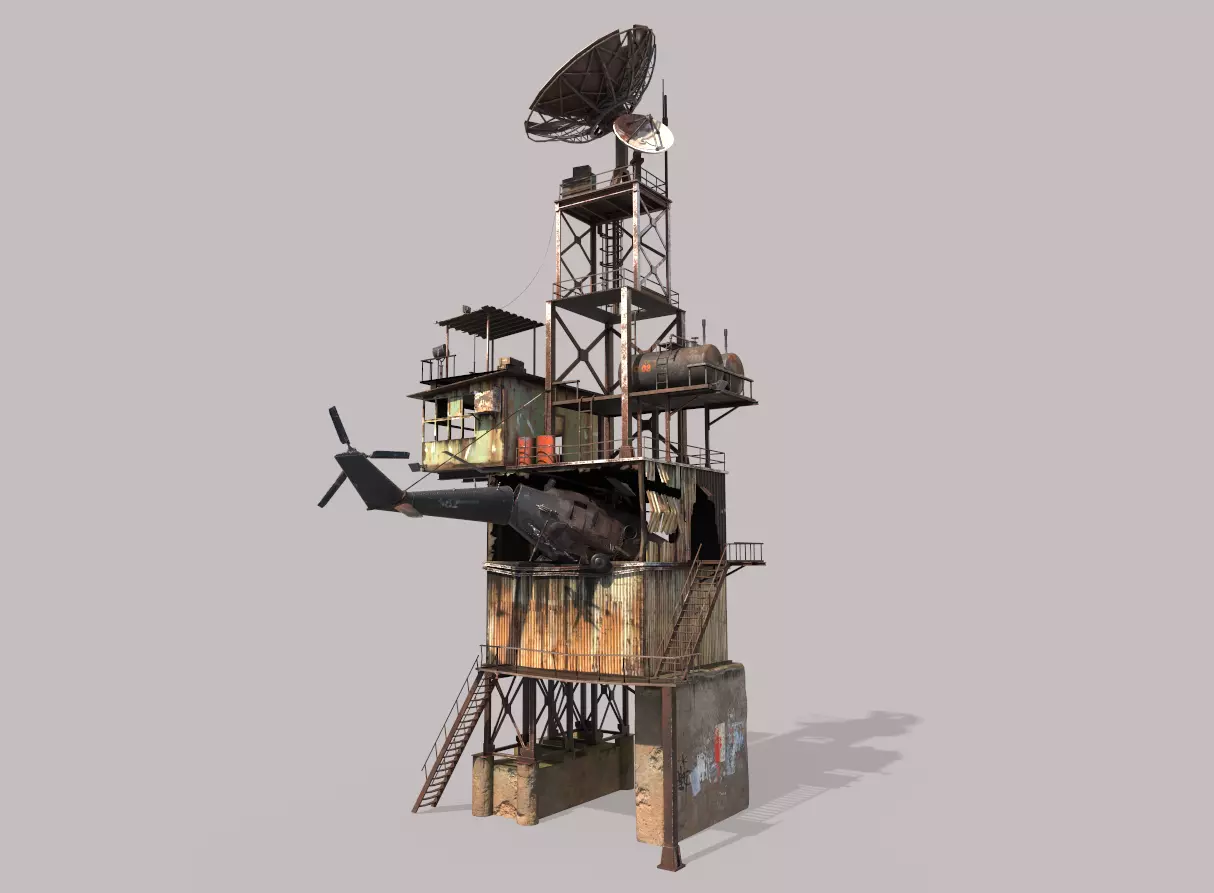 Model of Post-Apocalyptic Outpost Tower . Model is very realistic.It has 11 PBR material. All scene is one mesh. Maps are diffuse-specular-glossiness-height and normal. Model's textures has two sizes; 4096x4096-2048x2048. All maps are JPEG formats.