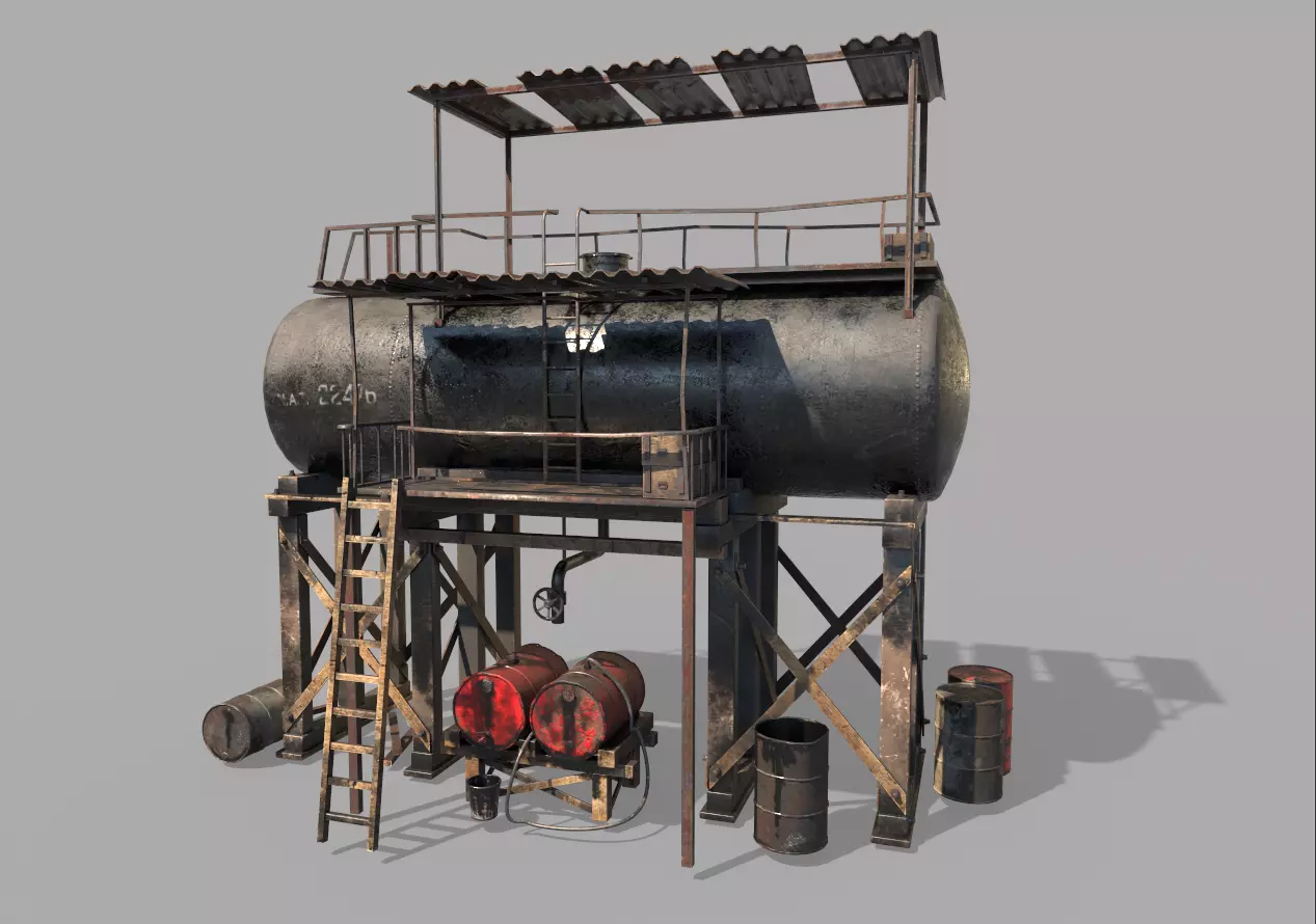 Model of Post-Apocalyptic Oil Station . The whole scene is one mesh. Model is very realistic.It has 5 PBR material.Maps are diffuse-specular-glossiness-height and normal. Model's textures has two sizes; 4096x4096-2048x2048. All maps are PNG formats and unwrapped, non-overlapping.
