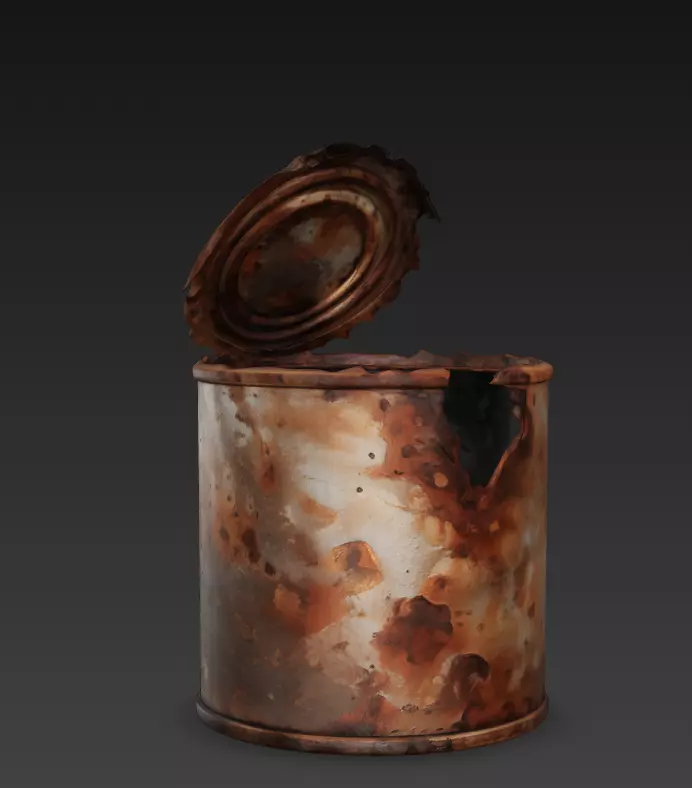 The model accurately captures the weathered decay of oxidized metal, featuring a physically accurate torn lid and jagged, bent edges that are incredibly difficult to replicate by hand.