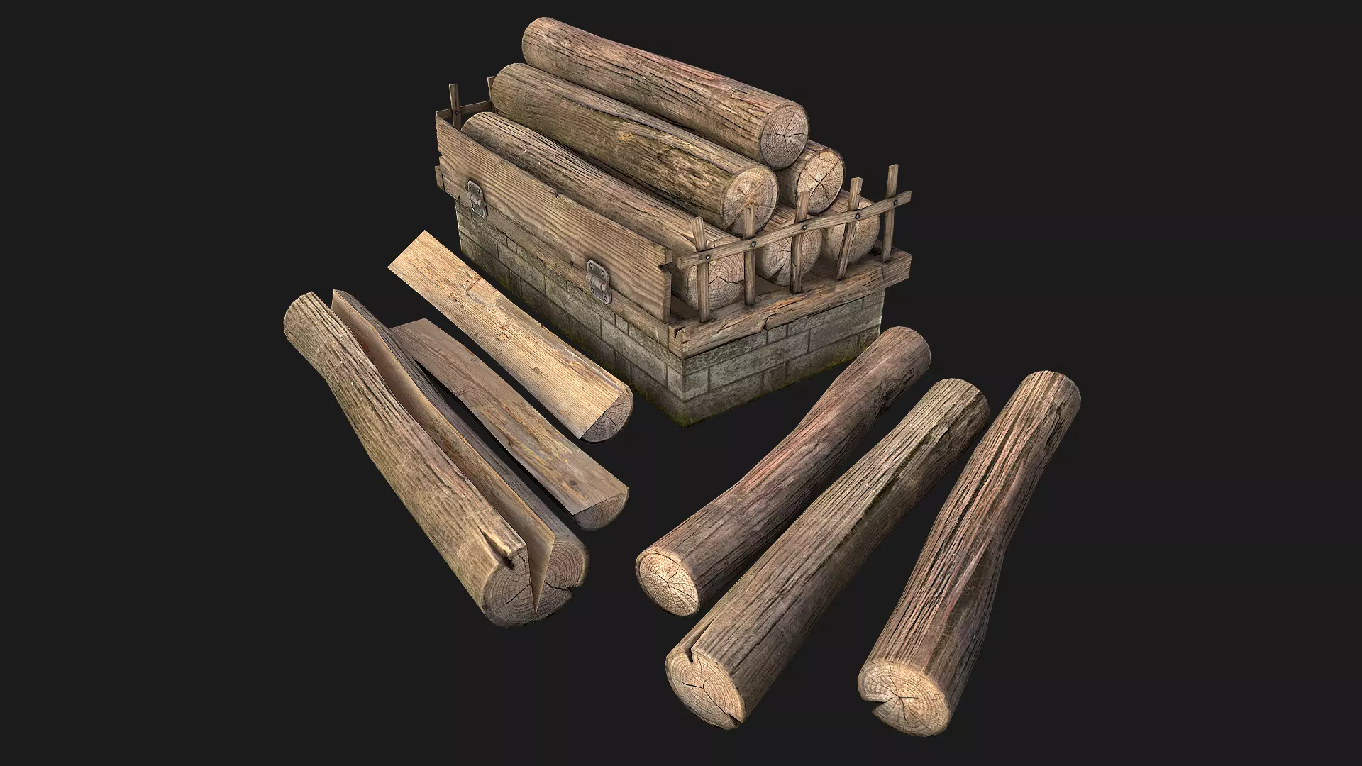 Game ready model.Stylized and detailed Sawmill Storage with Wooden Logs fully textured, sculpted and rendered with Physical based rendering (PBR) - Shown images have been rendered in Marmoset Toolbag .The models contains lods, detailed information on the images.The set contains 3 unique models of logs as well as 3 cut logs and Storage.