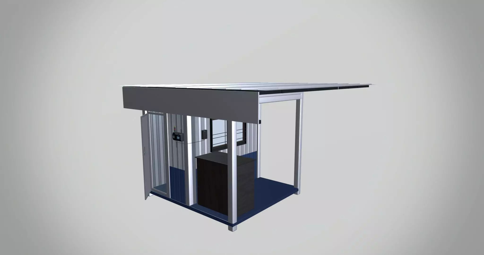 • This 3D rendering depicts a small metal kiosk designed to function as a security room.