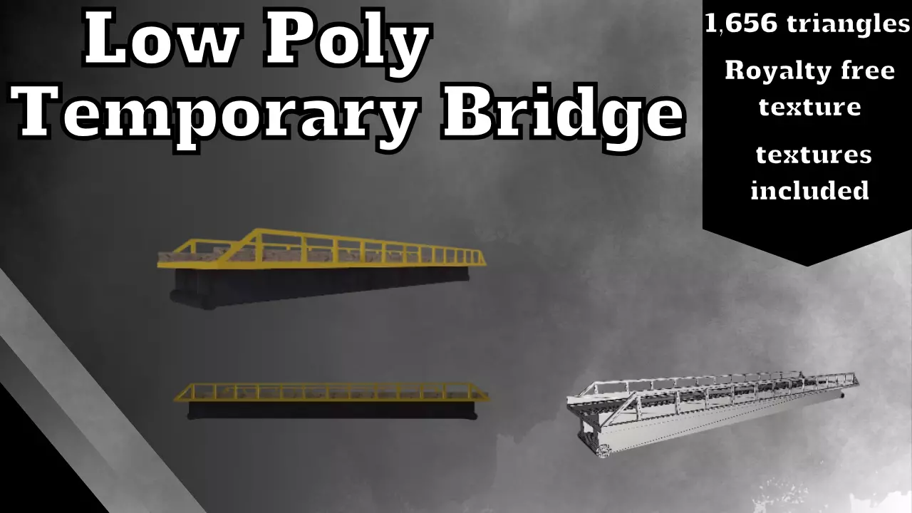 This is a low poly temporary bridge. Perfect for river crossings. This model has baked textures to easily add to any game engine without dealing with complex texture systems, as well as easy application of textures.