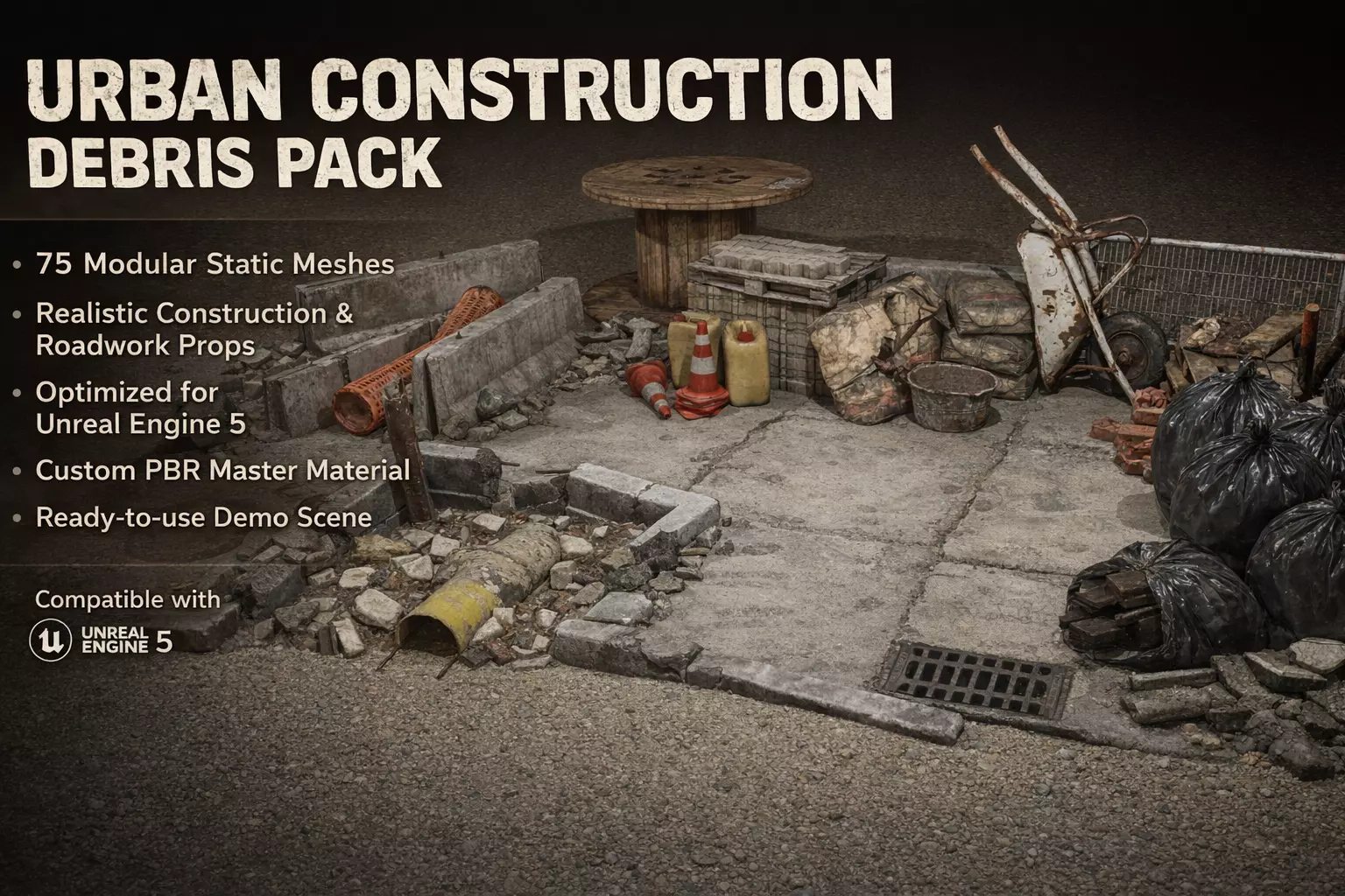 Urban Construction Props Pack is a high-quality, production-ready collection of realistic construction site assets designed for modern games, cinematics, and real-time visualization.The pack contains 75 unique static meshes covering a wide range of urban construction and roadwork elements: concrete debris, broken tiles, curbs, barriers, pipes, pallets, fences, tools, trash, props, and environmental details.All assets are optimized for real-time use and built with consistent scale and clean topology.Every mesh uses a custom unified PBR Master Material with flexible material instances, allowing quick global look adjustments without reworking textures.All assets are Nanite-ready and fully compatible with Unreal Engine 5.