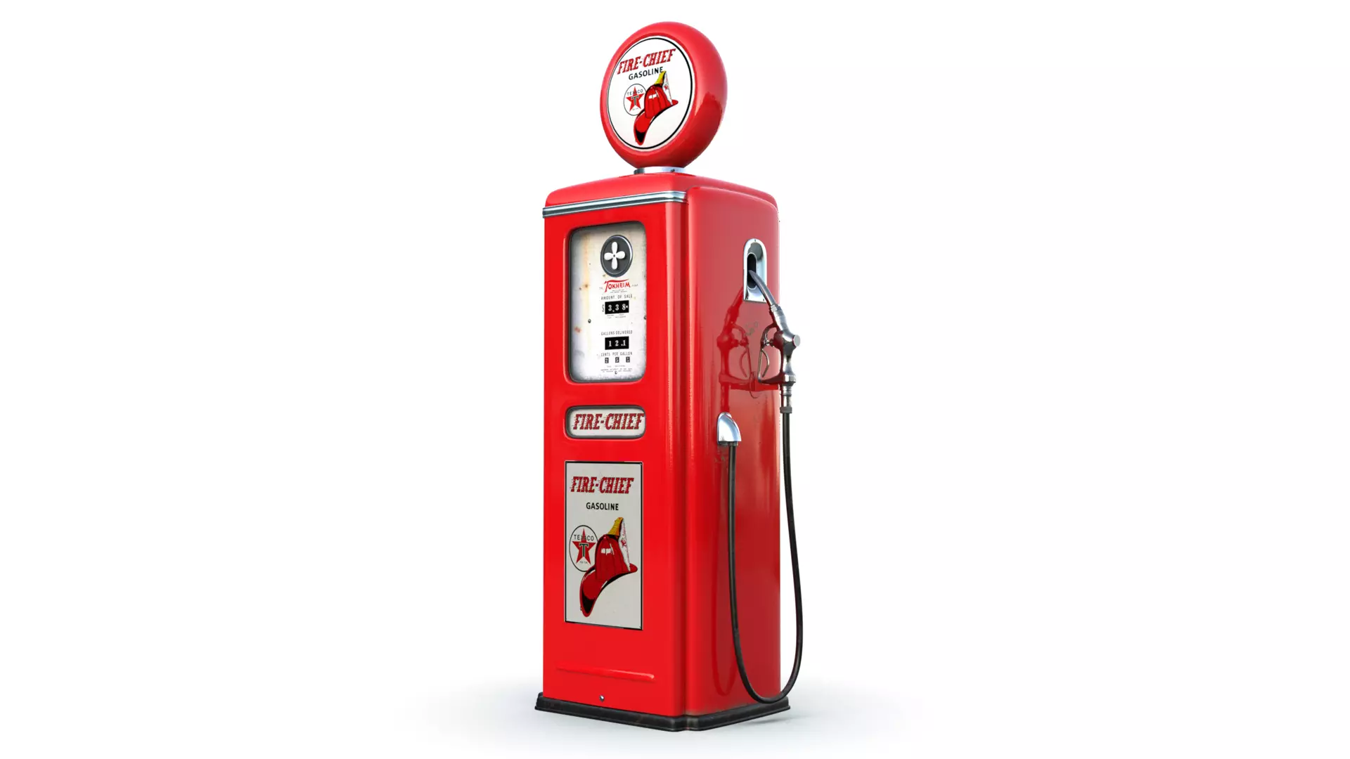 High quality Texaco Gasoline Pump model. Manufacturer: Tokheim. Model: T39 Year: 1948 Modeled in Maya 2016. All textures with 4096x4096. Real-world scale. Main Maps (Vray): Difuse, Glossiness, ior, Normal map, Opacity and Refection.Extra Textures: Ambiente Occlusion, Roughness, Metallic maps