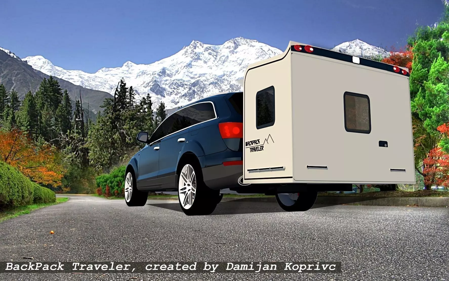 modern ,unique designed wheel- Less trailer.CAR backpack for easy travelling.Always have a room ready with the backpack traveller- Expandable Wheel-Less Trailer. By simply hitching this gadget to your vehicle, you’ll have somewhere to sleep wherever you go. When you close the backpack traveller, it offers more than 60 cubic feet of watertight and secure storage space for your equipment. In addition, it provides a full-size door so you can easily load cargo. When you open it, the patented backpack traveller turns into a sleeping area with more than 135 cubic feet of comfort. Suitable for up to three adults, the backpack traveller is bigger than a queen size bed. It offers low height for easy entry but provides plenty of head space so you can comfortably sit up. Wheel-free and completely suspended in the air, the backpack traveller hitches to any vehicle with at least Class 2 hitch.Model is done with sketch up and rendered with v-ray. All textures equipment is in high resolution,have been checked and are included in scene.Textures are compressed in zip file.Model is easy to manipulate and ready to render with v-ray.