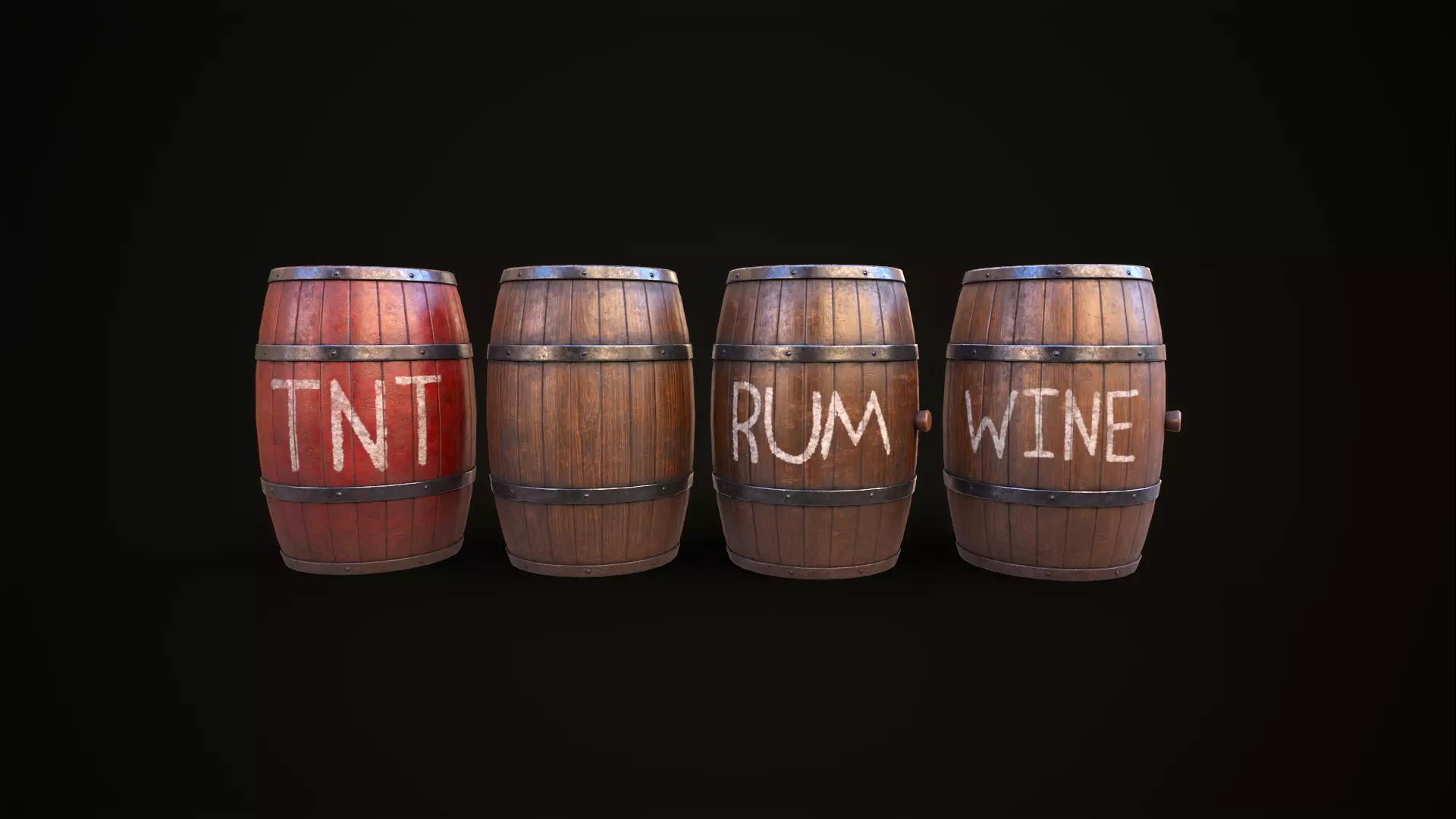 a barrel of wine, rum, red, tnt and a regular one.