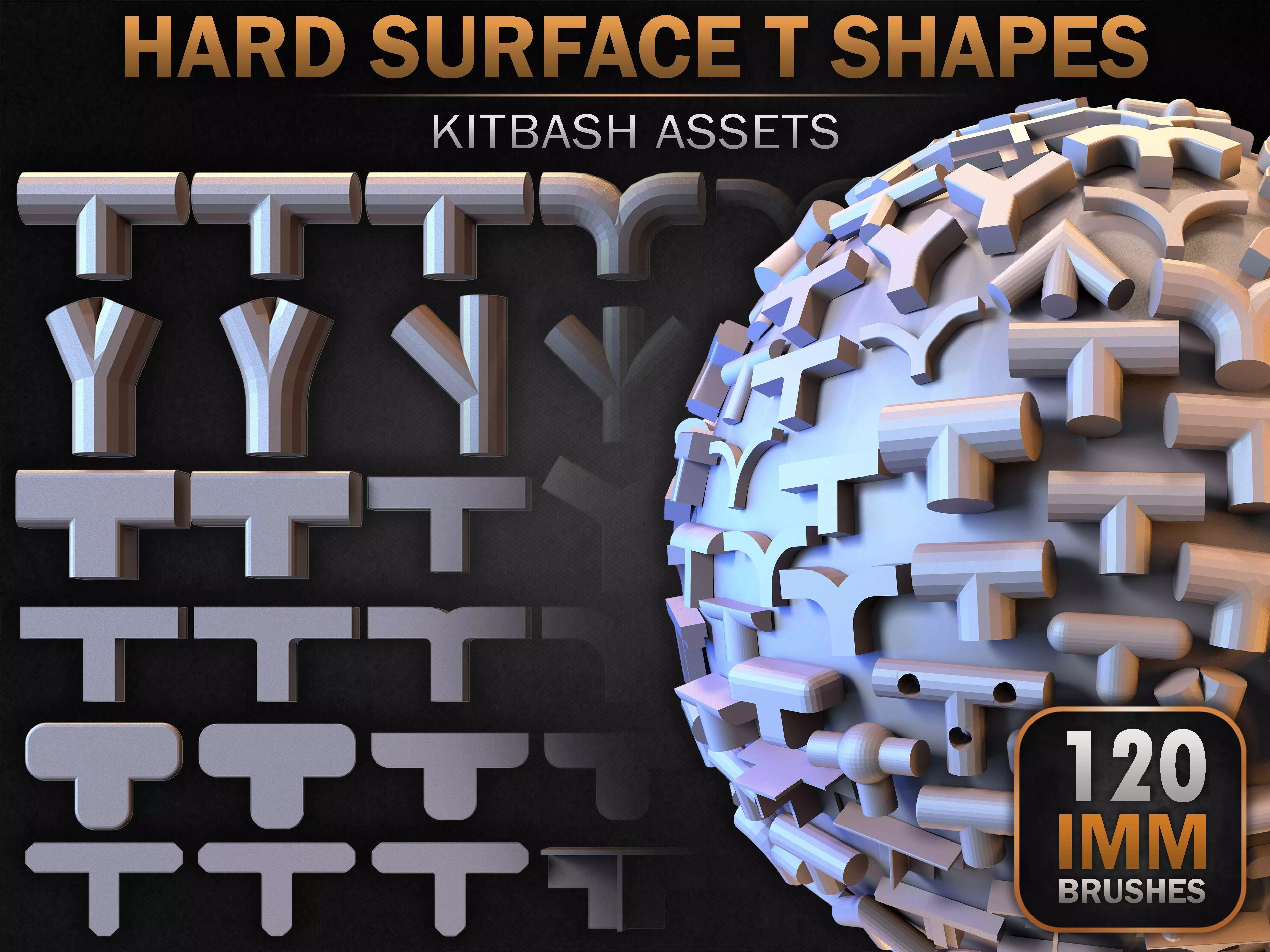 I am presenting a comprehensive collection of 120 hard surface IMM T-shaped elements, structured for modular construction, branching systems, and advanced hard surface workflows.